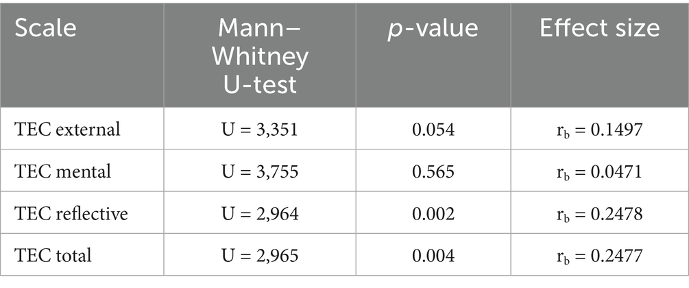 Analyses were conducted using Jamovi 2.3.28. The Shapiro–Wilk test (W) assessed normality assumptions. As data distributions violated normality, group comparisons employed the Mann–Whitney U- test; with effect sizes calculated using rank-biserial correlation (rb). Effect sizes were interpreted as: rb < 0.20 (negligible), 0.20–0.49 (small), 0.50–0.79 (medium), and ≥ 0.80 (large) per Cohen (2013) conventions. Measurement invariance was tested in JASP 0.95.2. Multigroup CFA (MGCFA) was applied to evaluate measurement invariance across groups. Configural invariance is considered confirmed with a Comparative Fit Index (CFI) ≥ 0.90; Standardized Root Mean Square Residual (SRMR) ≤ 0.08; and a Root Mean Square Error of Approximation (RMSEA) ≤ 0.06 When sample size is small (total N ≤ 300), the following cutoff criteria are suggested: for testing metric invariance, a change of ≤ − 0.005 in CFI, supplemented by a change of ≥ 0.010 in RMSEA or a change of ≥ 0.025 in SRMR would indicate noninvariance; for testing scalar invariance, a change of ≥ − 0.005 in CFI, supplemented by a change of ≥ 0.010 in RMSEA or a change of ≥ 0.005 in SRMR would indicate noninvariance (Chen, 2007).
