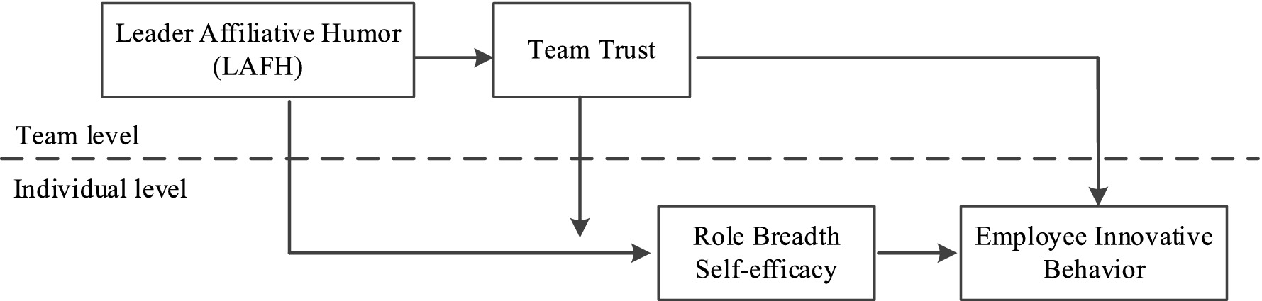 Second, limited understanding exists regarding the mechanisms through which LAFH affects employee innovative behavior. According to social information processing (SIP) theory, subordinates perceive and process information about the behaviors exhibited by their leaders (social cue), subsequently influencing their subsequent attitudes and behaviors (Salancik and Pfeffer, 1978). Guided by SIP theory, LAFH, on the one hand, through sharing interesting anecdotes and engaging in friendly interactions, can be easily perceived by subordinates as a sign of leaders’ benevolence and amicable demeanor (Xu et al., 2023). On the other hand, through humorous communication, leaders implicitly convey values (e.g., “innovation is encouraged”, “mistakes are acceptable”), which reduces fear of making errors. This, in turn, enhances employees’ task confidence, raises their role breadth self-efficacy, eventually improving employee innovative behavior. Likewise, LAFH, through engaging in friendly interactions, can create a relaxed and enjoyable climate within the organization (Yang and Wen, 2021; Xu et al., 2023), thereby cultivating team trust, eventually enhancing employee innovative behavior. Hence, this study will adopt role breadth self-efficacy and team trust as mediating role to unpack the mechanism by which LAFH affects employee innovative behavior.