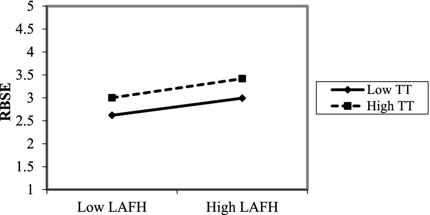 Moreover, following the moderation approach recommended by Aiken et al. (1991), the interactive impact of LAFH and team trust on role breadth self-efficacy is depicted in Figure 2. From Figure 2, it can be observed that the positive relationship between LAFH and role breadth self-efficacy is stronger at higher levels of team trust than at lower levels.