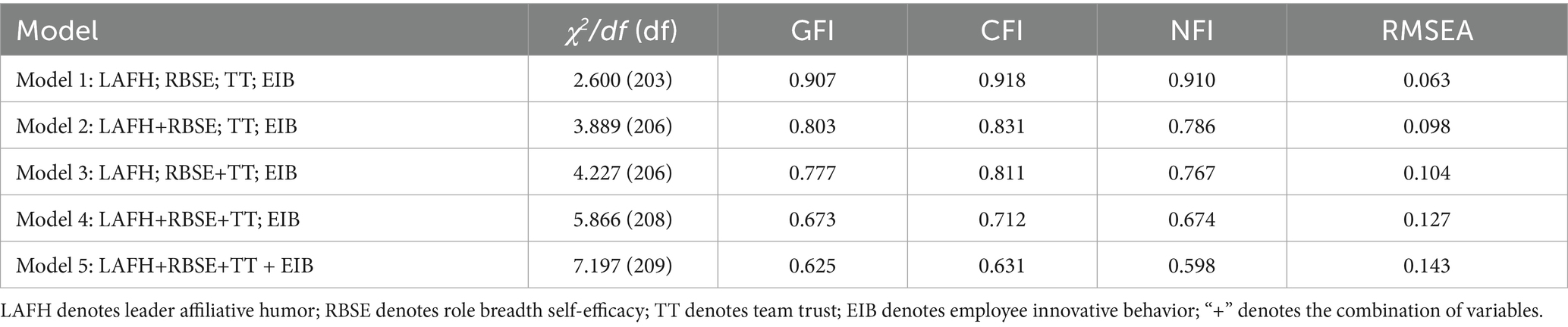 This study conducted confirmatory factor analysis (CFA) via AMOS 22.0 statistical analysis software. The hypothesized four-factor model (Model 1: LAFH, role breadth self-efficacy, team trust, and innovative behavior) was compared with other alternative nested models (Models 2–5), as detailed in Table 1. The results indicate a good fit for the hypothesized four-factor model, with χ2/df = 2.600, GFI = 0.907, NFI = 0.910, CFI = 0.918, RMSEA = 0.063. These values meet the criteria for statistical validation, with χ2/df values between 1 and 5, and CFI, GFI, NFI exceeding 0.9, and RMSEA below 0.08 (Hu and Bentler, 1999). Clearly, the hypothesized four-factor model demonstrates higher goodness of fit compared to the other alternative nested models (Models 2–5), indicating better discriminant validity.