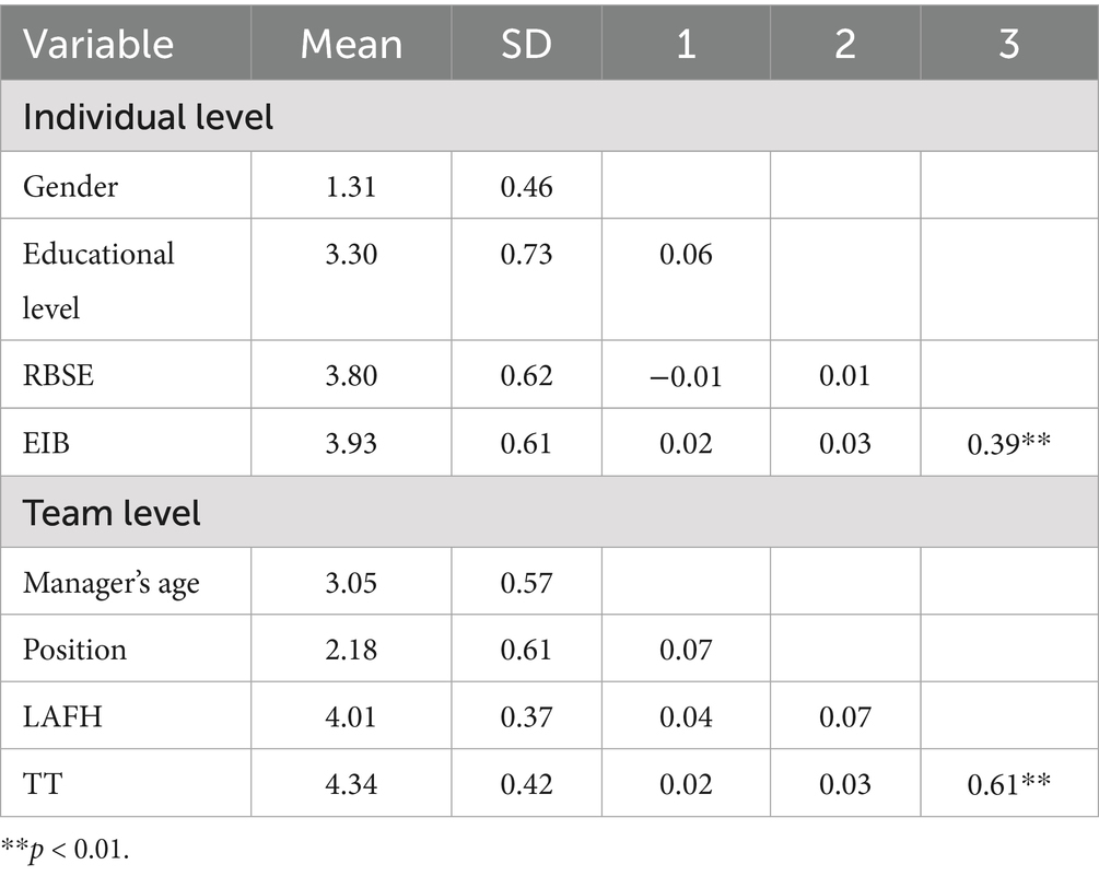 Following prior studies (Wang et al., 2022; Ma et al., 2023), we included control variables to account for their potential effects on employee innovative behavior. At the individual level, controls included demographics such as gender and education; at the group level, controls included leaders’ age and position. Moreover, key constructs, such as LAFH, role breadth self-efficacy, team trust, and innovative behavior, were assessed using a Likert 5-point scale, with the exception of the control variables. Meanwhile, the value of Cronbach’s alpha of the aforementioned scales all exceeded the recommended value of 0.70, signifying high measurement quality in this survey.