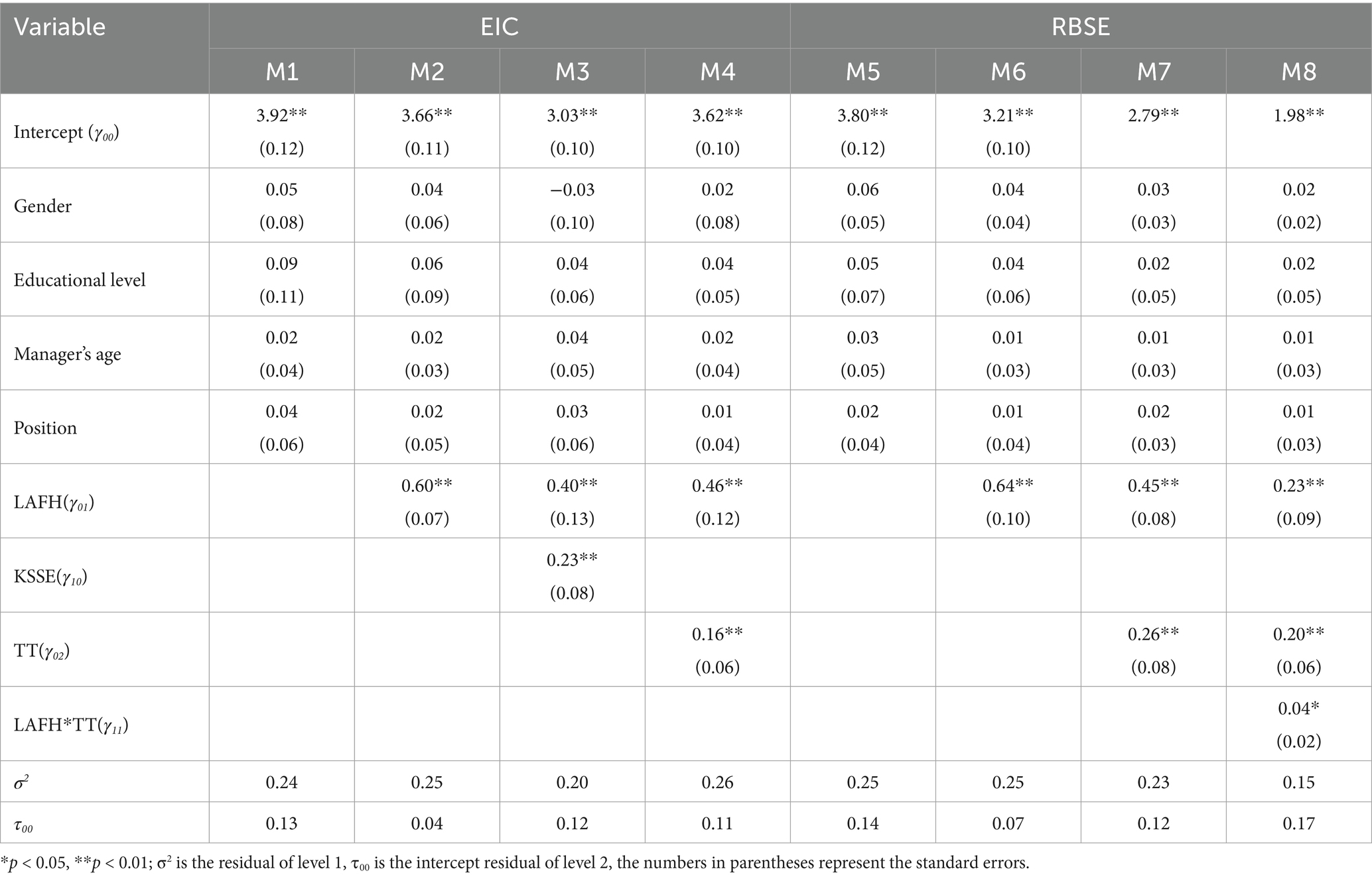 First, the rapid development of the knowledge economy poses a primary challenge for leaders: how to promote employee innovative behavior to sustain and enhance organizational competitive advantage. Existing research attempts to explain the relationship between leadership behavior and employee innovative behavior, the mechanisms, situational characteristics. It suggests that leaders’ characteristics and behaviors (e.g., leader trait positive affect, entrepreneurial leadership, etc.) stand as significant predictive factors for employee innovative behavior, while neglecting the research on the relationship between LAFH and employee innovative behavior (Cooper et al., 2018). LAFH, on one hand, shares commonalities with other leadership behaviors (charismatic leadership, transformational leadership, servant leadership, etc.) and influencing employee behavior. On the other hand, in terms of leader-employee relationships, alternate leader behaviors primarily amplify employees’ intrinsic motivation to increase their proactiveness, thereby yielding benefits for organizations and employees. Conversely, LAFH, as a positive socioemotional resource offered by the leader, signals support and amicability, strengthens employees’ confidence, and promotes employees’ proactive and extra-role behaviors (Kong et al., 2019). This, in turn, leads to facilitating the generation and implementation of new ideas, thereby enhancing employee innovative behavior. Furthermore, LAFH possesses multilevel attributes, yet most studies examine leadership at a single level and neglect team-level effects on employee attitudes and actions. Therefore, this study focuses on the multilevel attributes of LAFH, exploring its multilevel relationship with employee innovative behavior. The research results also indicate that LAFH contributes to promoting employee innovative behavior.