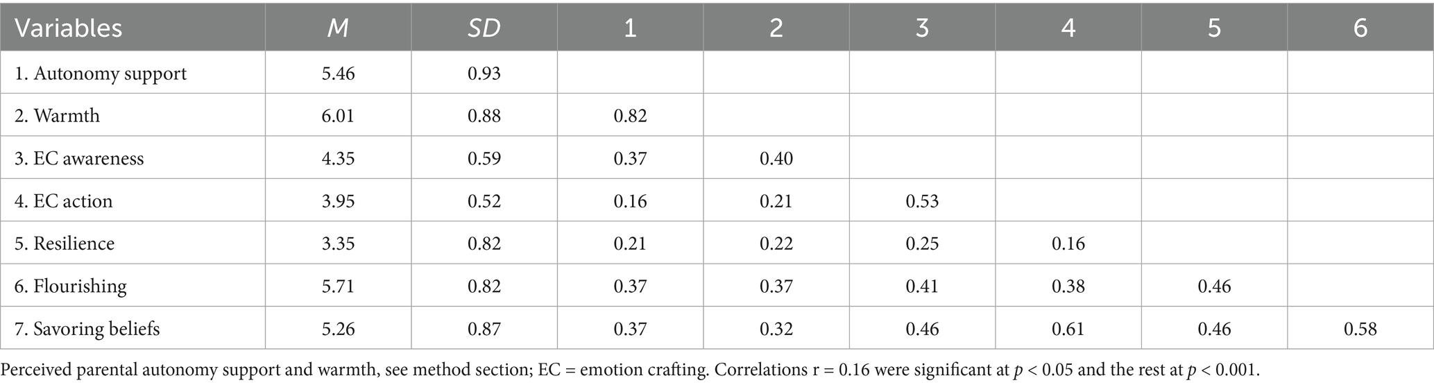 EC awareness and action showed positive correlations with perceived parental autonomy support and warmth, well-being, and savoring beliefs, see Table 1. EC awareness showed medium associations with parenting, flourishing, and savoring, while EC action showed small associations with parenting and resilience, and moderate associations with flourishing and savoring. Additionally, the EC variables were strongly correlated with each other, as were the well-being variables and the parenting variables.