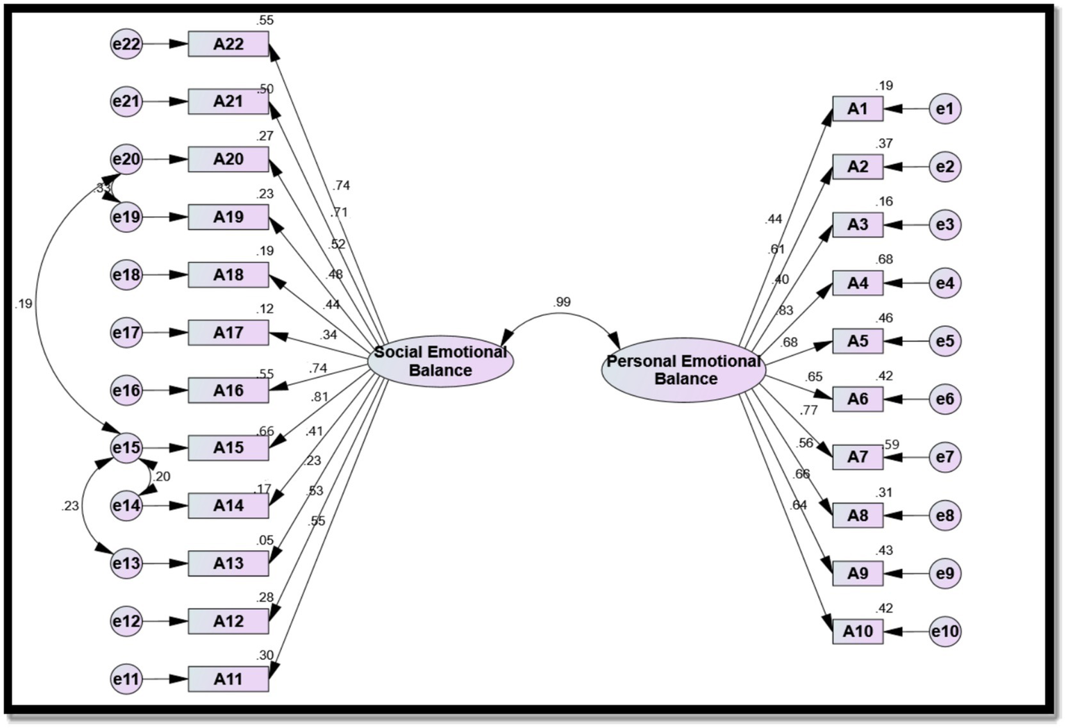 The validity of the emotional balance scale in the current study was examined through CFA using AMOS v24 after administering the scale to the pilot study participants (n = 100). It was hypothesized that the latent factors of the scale would organize into two factors: factor 1 (personal emotional balance) and factor 2 (social emotional balance). These two factors comprised a total of 22 observed variables. Specifically, factor 1 consisted of 10 observed variables, and factor 2 comprised 12 observed variables. Table 2 and Figure 2 illustrate the CFA of the emotional balance scale.