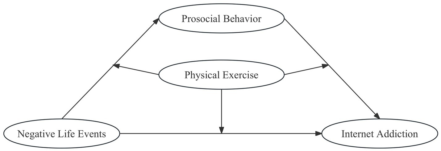 This study aims to investigate the mediating role of prosocial behavior in the relationship between negative life events and Internet addiction among college students and analyze the pivotal role of physical exercise. The assumed model is depicted in Figure 1.