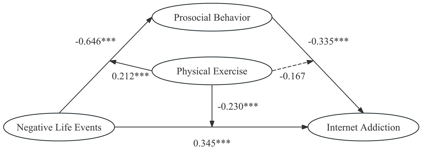 Prosocial behavior significantly mediates the relationship between negative life events and Internet addiction. Moreover, physical exercise at varying levels exerts differential moderating effects on the relationship between negative life events, prosocial behavior, and Internet addiction.