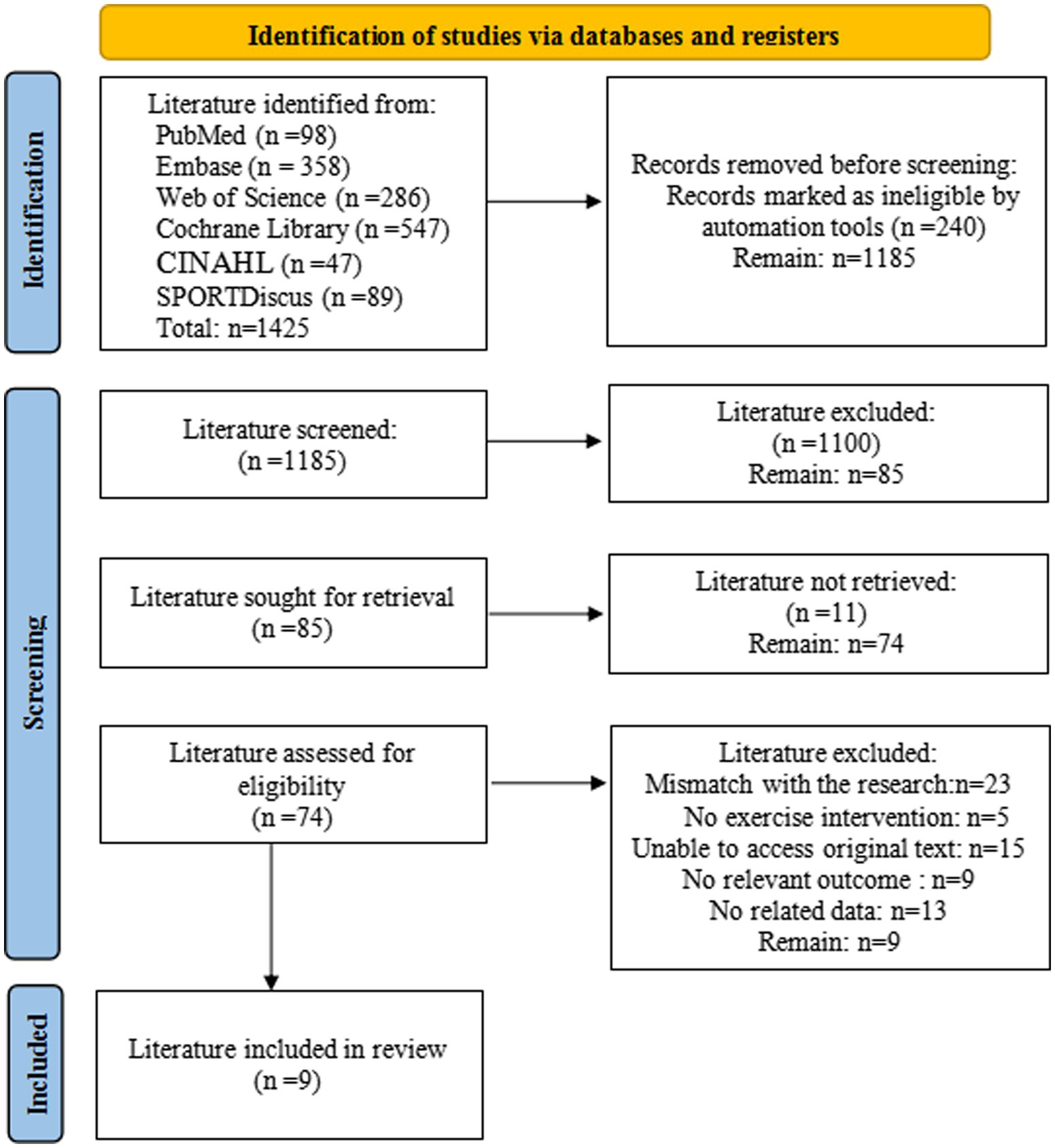Flowchart illustrating the identification and selection process for studies via databases and registers. From 1,425 records identified, 240 were removed. 1,185 remained for screening, and 1,100 were excluded. 85 were sought for retrieval, with 11 not retrieved, leaving 74 for eligibility assessment. 65 were excluded due to mismatches or irrelevance, resulting in 9 studies included in the review.
