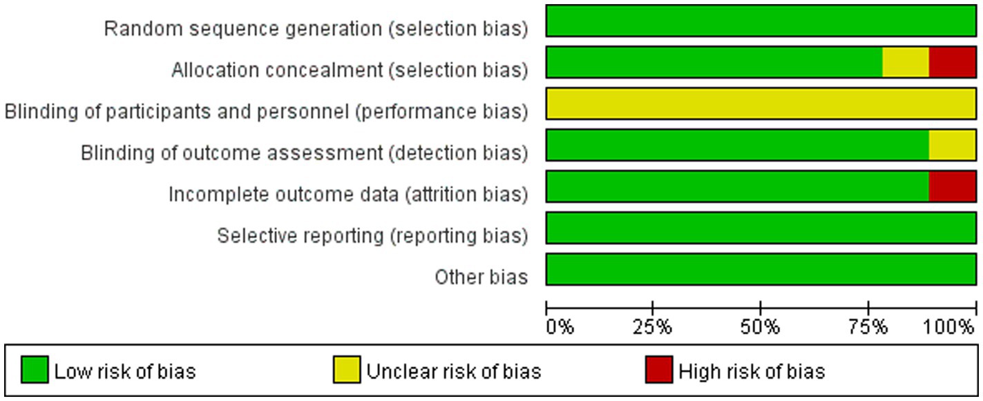 Quality assessment of the included studies was conducted using the Cochrane Risk of Bias Tool. The overall risk of bias results is shown in Figure 2.
