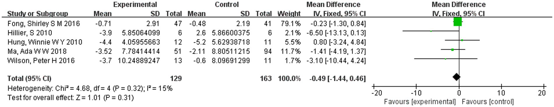 For the MABC scale, 5 studies (Wilson et al., 2016; Hillier et al., 2010; Fong et al., 2022; Hung and Pang, 2010; Ma et al., 2018) were included in the literature, with a total sample size of 292 subjects. Since the same scoring criteria for the MABC scale were used across studies, the MD was selected for effect size pooling. The results showed no significant heterogeneity (I2 = 15%, p = 0.32); thus, a fixed-effects model was applied for the analysis. The combined effect size was MD = −0.49, Z = 1.01 (p = 0.31) with a 95% CI of −1.44 and 0.46. The forest plot (Figure 3) shows that the MD 95% CI for the effect of PA on children’s motor coordination development aligns with the line of no effect. This indicates that there was no statistically significant difference between the PA and control groups in the MABC outcome indicators for children and adolescents with DCD (p = 0.31). Although the meta-analysis revealed an overall negative effect with low heterogeneity among the studies (I2 = 15%), we conducted exploratory subgroup analyses to investigate whether the effects of PA interventions were influenced by key covariates to gain deeper insights into these findings. Given the limited number of included studies (n = 5), three covariates were selected for analysis: PA intensity, session duration, and total intervention cycle. Each variable was divided into two subgroups based on statistical characteristics, ensuring that each subgroup contained at least two studies. The results of the subgroup analysis are summarized in Table 3, and the corresponding forest plots are shown in Supplementary Figure S1.