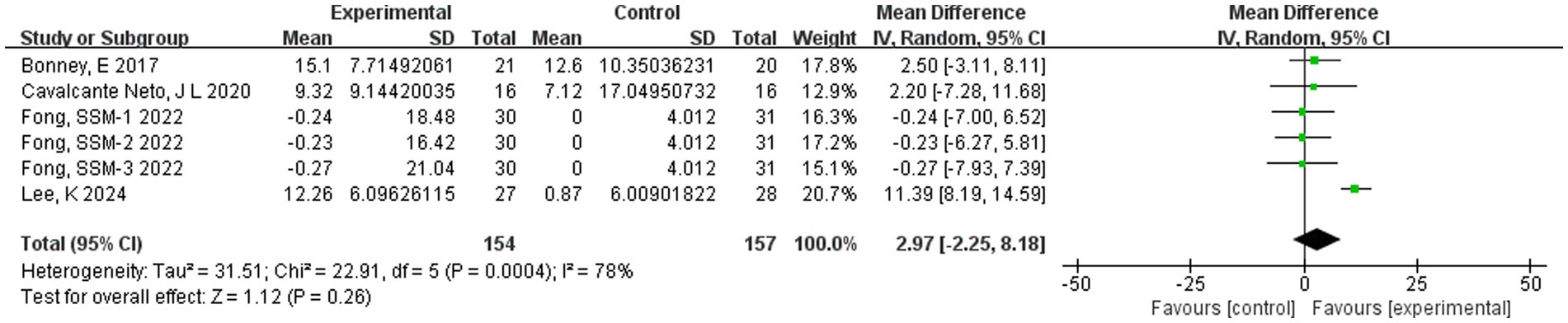 For the MABC-2 scale, 4 studies (Lee, 2024; Cavalcante et al., 2020; Fong et al., 2016; Bonney et al., 2017) were included in the literature, and the sample size of subjects was 251. Since the MABC-2 scoring criteria were consistent across studies, MD was selected for effect size pooling. The results exhibited significant heterogeneity (I2 = 78%, p < 0.01), and the random-effects model was used for the analysis. The combined effect size is MD = 2.97, Z = 1.12 (p = 0.26) with a 95% CI of −2.25 and 8.18. The forest plot (Figure 4) shows that the MD 95% CI for the effect of PA on children’s motor coordination development aligns with the line of no effect. This indicates that there was no statistically significant difference between the PA and control groups in the MABC-2 outcome indicators for children and adolescents with DCD (p = 0.26). Although the meta-analysis revealed an overall negative effect, the studies exhibited high heterogeneity (I2 = 78%). To further investigate the sources of heterogeneity, we conducted subgroup analyses. Given the limited number of included studies (n = 4), we selected three covariates for analysis: PA intensity, session duration, and weekly frequency. Each covariate was divided into two subgroups based on statistical characteristics, ensuring that each subgroup contained at least two studies. The results of the subgroup analysis are summarized in Table 4, and the corresponding forest plot is shown in Supplementary Figure S2.