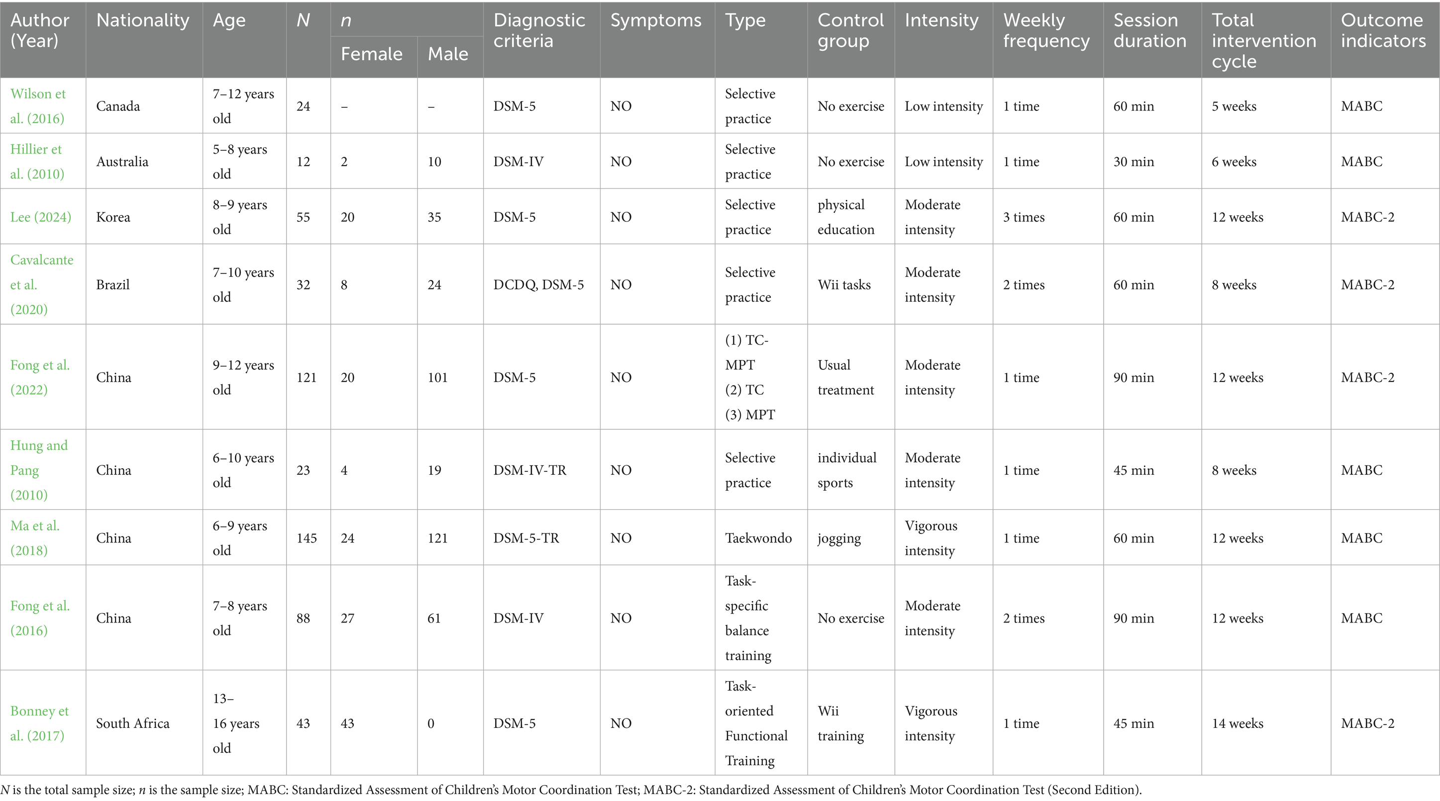 Table 1 shows the main characteristics of all included studies. All nine studies were RCTs that incorporated pre- and post-tests. These nine studies included 543 children and adolescents with DCD. The smallest sample size was 12 participants, while the largest was 145. One study recruited only female participants, and one did not specify the gender of the subjects. The publication dates of these studies ranged from 2010 to 2024, with participants aged 5–16. Regarding the types of PA, five studies employed selective exercises; one study utilized a multi-group experimental design with three intervention groups: Tai Chi plus strength training, Tai Chi alone, and strength training alone; one study adopted a group exercise mode; one study implemented task-specific balance training; one study incorporated Taekwondo training; and one study utilized task-oriented functional training. Regarding PA intensity, two studies were low-intensity, five studies were moderate-intensity, and two studies were vigorous-intensity. In terms of weekly frequency, six studies involved exercising once per week, two studies involved exercising twice per week, and one study involved exercising three times per week. Session duration varied across the included studies: one study involved a 30-min session, two studies involved 45-min sessions, four studies involved 60-min sessions, and two studies involved 90-min sessions. The total intervention cycle varied across the included studies: two studies had cycles of 5 and 6 weeks, respectively; two studies had a cycle of 8 weeks; four studies had a cycle of 12 weeks; and one study had a cycle of 14 weeks. All studies used the MABC test to assess motor coordination in children and adolescents with DCD. Among these, five studies utilized the MABC scale, whereas four studies employed the MABC-2 scale.