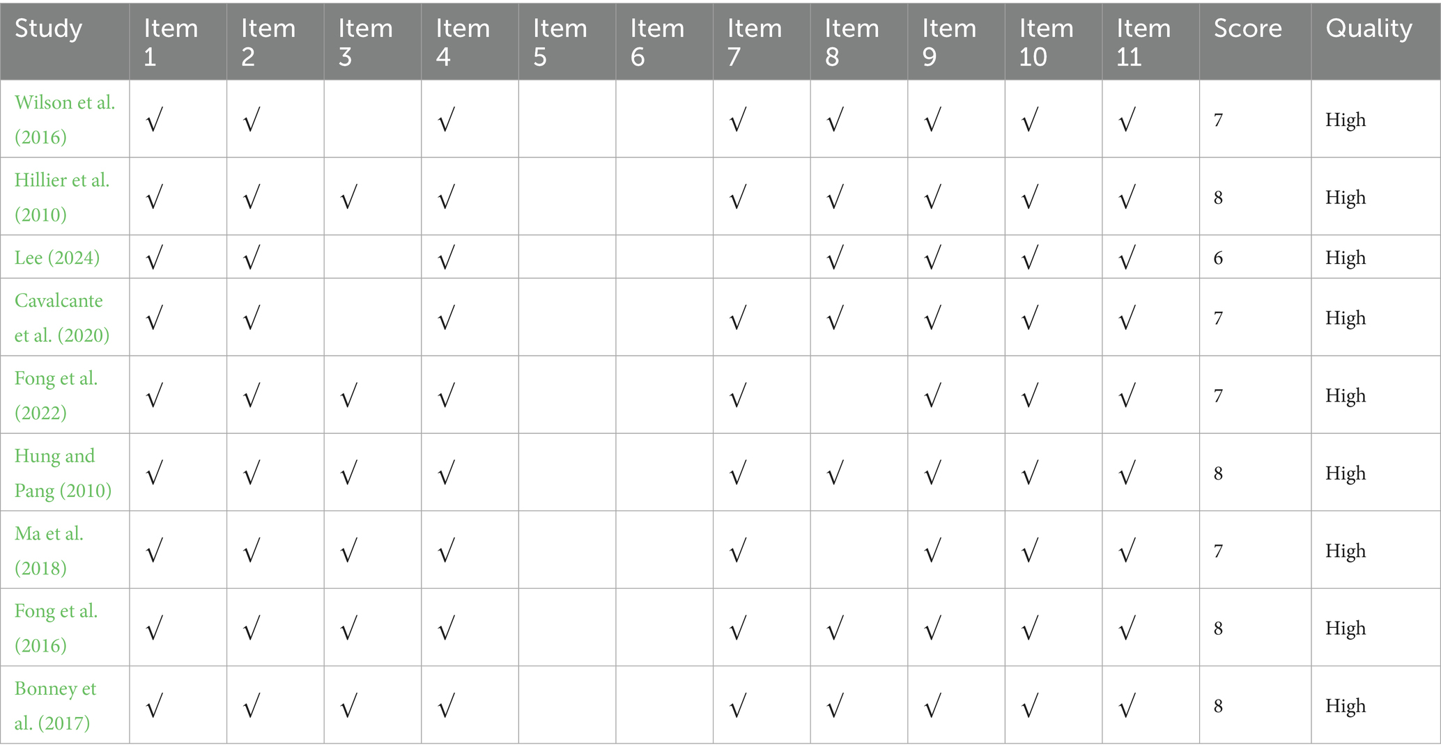 Quality assessment of the included studies was conducted using the PEDro scale. All studies adhered to the principles of randomization, baseline similarity, statistical analysis of intergroup results, point measurement, and calculation of difference values. Six studies used allocation concealment. Blinding was performed on outcome assessors in eight studies. PEDro scores ranged from 6 to 8, indicating an overall high quality (Table 2).