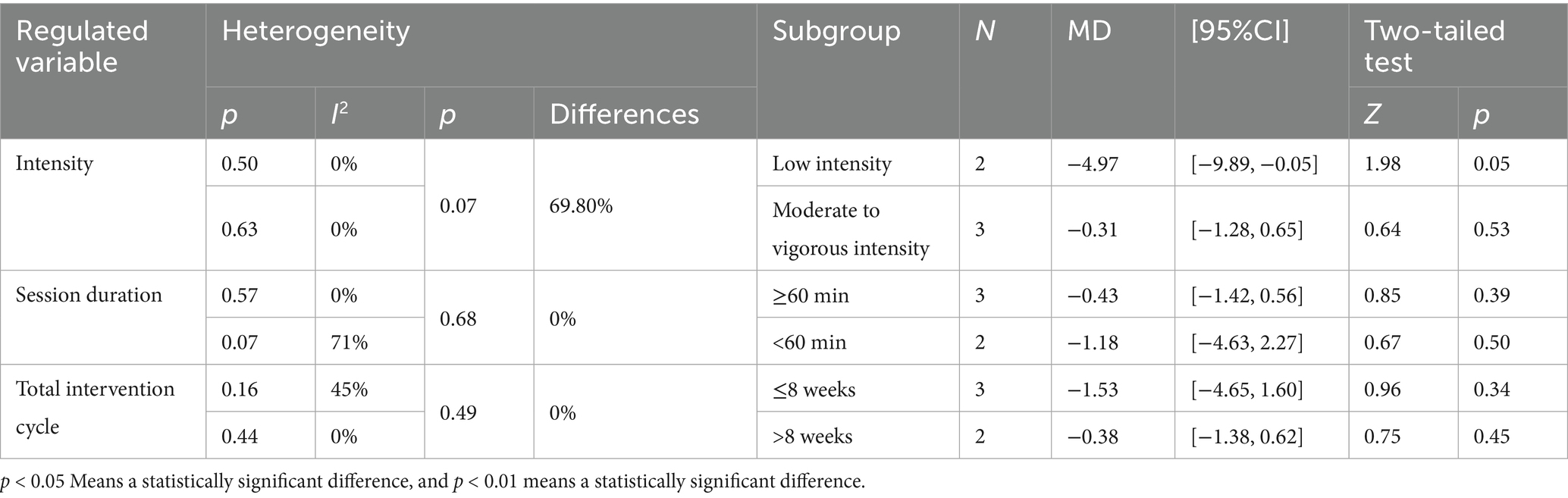 Although the overall pooled analysis showed no statistically significant effect of the intervention, a clear trend was observed in the PA intensity subgroup analysis based on our pre-specified subgroup analyses. The effect size was relatively larger in the low-intensity PA intervention group (MD = −4.97, 95% CI: −9.89, −0.05; p = 0.05), approaching statistical significance. In contrast, the effect size was smaller and non-significant in the moderate-to-vigorous-intensity PA group (MD = −0.31, 95% CI: −1.28, 0.65; p = 0.53). The confidence intervals for the two sets of effect values did not overlap. The p-value of the between-group differences was 0.07, failing to reach statistical significance. However, the heterogeneity index (I2 = 69.8%) indicated that PA intensity was likely the main factor contributing to the differences among studies. In contrast, subgroup analyses based on session duration (≥60 min and <60 min) and total intervention cycle (≤8 weeks and >8 weeks) revealed no statistically significant differences in effect sizes between subgroups (between-group p values of 0.68 and 0.49, respectively), with low between-group heterogeneity (I2 = 0%). Furthermore, the pooled effect sizes within each subgroup failed to demonstrate statistical significance.