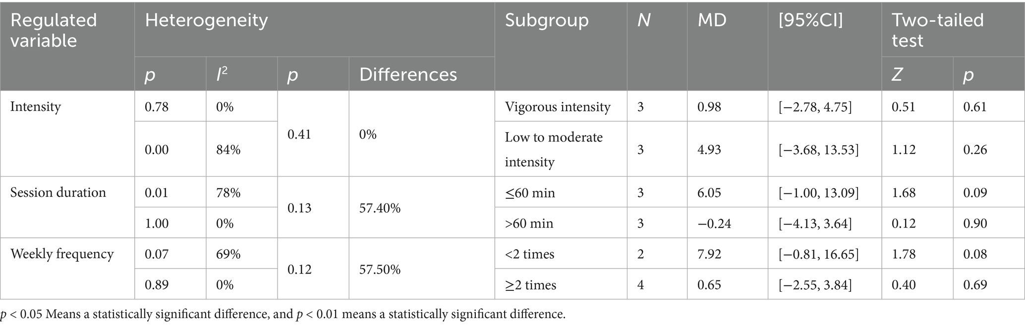 The results indicate that none of the examined covariates can effectively explain the sources of heterogeneity across studies. Specifically, within the different PA intensity subgroups, vigorous-intensity (I2 = 0%) and low-to-moderate-intensity (I2 = 84%) showed no statistically significant differences in effect sizes between subgroups (p = 0.41). In the different session duration subgroups, the ≤60-min group (I2 = 78%) and the >60-min group (I2 = 0%) were not statistically significant in effect size between subgroups (p = 0.13). There was no significant difference in effect size between subgroups <2 times (I2 = 69%) and ≥2 times (I2 = 0%) in the subgroups with different weekly PA frequencies (p = 0.12). Meanwhile, our subgroup analysis showed that no subgroup classification exhibited insignificant heterogeneity within groups, which subsequently became significant after pooling. It is noteworthy that after subgroup analysis, significant heterogeneity persisted within multiple subgroups, suggesting that more important unidentified factors have driven the variation in outcomes.