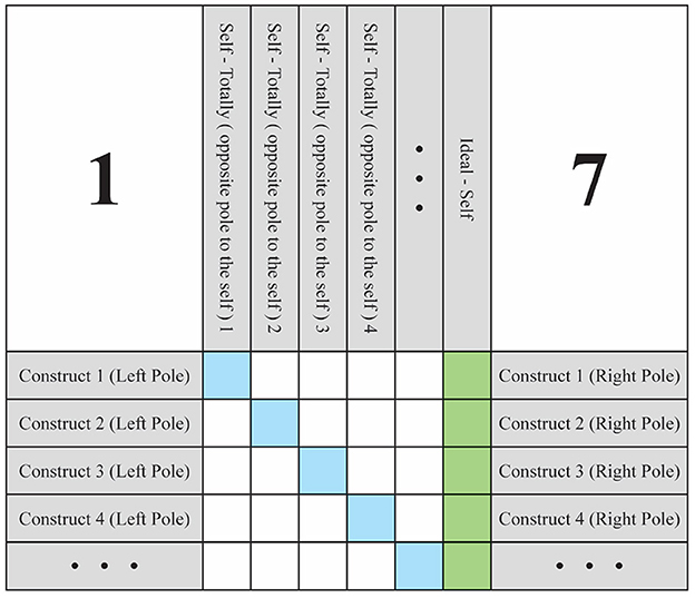 The first step is to identify a set of personal constructs that are meaningful to the participant. These constructs can be elicited through a variety of methods such as triadic comparisons, self-characterizations, or open interviews (see Fransella et al., 2004; Hinkle, 1965; Keen and Bell, 1980; Kelly, 1955; Neimeyer et al., 2002). The chosen constructs should be relevant to the participant's desired psychological changes and reflect both personal goals and perceived difficulties.