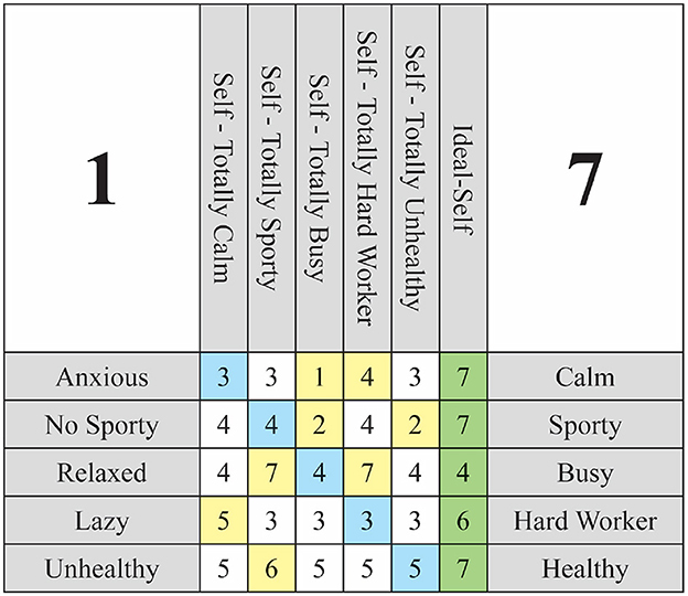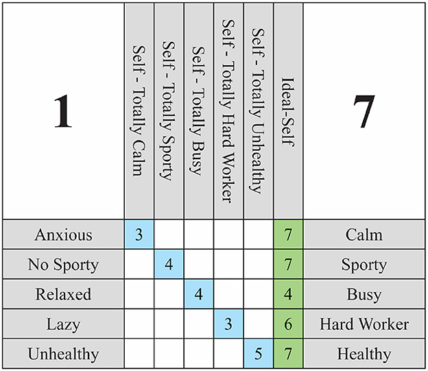 • If both the Self-Now and Ideal-Self ratings are located at the midpoint of the scale (e.g., 4 on a 1–7 scale), indicating no clear preference toward either pole, the construct will be arbitrarily assigned to the right pole to define the hypothetical self.