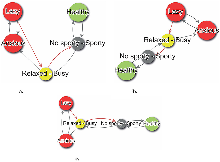 Referring to Figure 4, the subject self-identifies as healthy, aligning with their ideal in this regard. However, they also perceive themselves as lazy and anxious, which contrasts with their ideal self-image. Notably, there is no clear ideal associated with the Free-Busy construct, and the individual remains undecided between the poles of Sporty and No Sporty. Examining the digraph's edges reveals key relationships among constructs. For example, a positive feedback loop strengthens the link between Healthy and Sporty. Additionally, there is a direct association between being Busy and experiencing anxiety, with anxiety also contributing to laziness. A self-regulatory, or negative feedback loop, further connects Busy, Anxious, and Lazy constructs, among others. Together, these insights elucidate the structural dynamics of the individual's PCS.