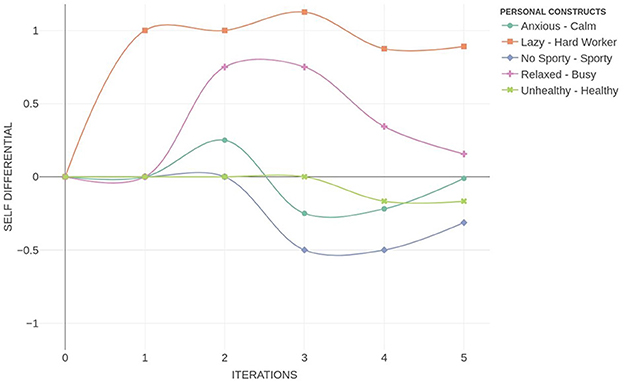 This form of simulation enables practitioners to visualize how an individual anticipates the systemic consequences of adopting a particular personal construct. In the case illustrated in Figure 8, the hypothetical scenario of becoming a “Hard Worker” initiates a dynamic trajectory of change throughout the personal construct system. The simulation shows that this shift leads to an anticipated increase in “Busy”, suggesting that the person links hard work with heightened activity or workload. Subsequently, this change triggers an activation of “Anxious”, indicating a perceived emotional cost associated with this anticipated change. Interestingly, this ripple effect extends further, exerting a subtle negative influence across additional constructs, which gradually deviate from their initial self-position. This illustrates how a seemingly desirable change (e.g., working harder) may be internally associated with stress or imbalance. Such patterns—otherwise difficult to infer from static representations—can inform practitioners about the anticipatory logic underpinning the client's meaning system, and help identify which constructs act as amplifiers of conflict or targets for psychological intervention.