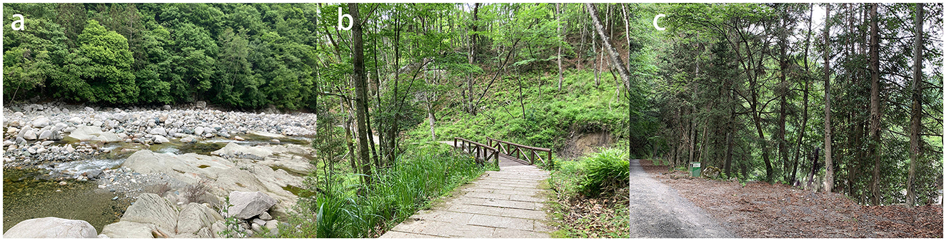 Recent studies have increasingly emphasized the importance of forest environments as health-promoting settings, highlighting the therapeutic potential of forest therapy. Research indicates that forest therapy has restorative effects on the human body (Liu et al., 2018; Shao and Wang, 2020), and can alleviate stress states and induce physiological relaxation (Lee J. et al., 2014; Song et al., 2017). Yu et al. (2017) conducted an experiment demonstrating the positive effects of short-term forest therapy on the heart rate and blood pressure of middle-aged and elderly individuals. Forest walking has been shown to lower stress hormone levels, relax the mind, and improve sleep quality (Lin et al., 2022). Ideno et al. (2017) suggest that the autonomic nervous system plays a crucial role in blood pressure regulation, and that norepinephrine levels and heart rate changes can reflect autonomic nervous system activity. Furthermore, studies have indicated that forest walking can improve immune function (Le Gear et al., 2023). After spending time in forest settings, the expression of perforin by natural killer cells and CD8+ T-lymphocytes is significantly decreased, and the production of pro-inflammatory cytokines, including interferon-gamma and interleukin-6 has a significant reduction. Deng et al. (2023) reported that short-term interventions in forest settings can significantly improve pulmonary ventilation function in patients with COPD, particularly in women compared to men. From the psychological aspect, forest therapy positively impacts stress recovery, nature connectedness, and creativity (Keller et al., 2024; Subirana-Malaret et al., 2023). Relevant research emphasizes that connecting with nature can improve wellbeing, promote cognitive restoration, and reduce stress (Vella-Brodrick and Gilowska, 2022). Yu et al. (2022) point out that volatile organic compounds released by trees, such as phytoncides, can alleviate negative emotions and induce positive moods. Other studies have validated the efficacy of forest therapy in enhancing sleep and reducing emotional stress among medical workers (Kim et al., 2022), and Kavanaugh et al. (2022) propose that healthcare providers engage in regular forest bathing practices to alleviate stress and professional burnout. The findings from scholars suggest that forest therapy can provide a valuable method for psychological relaxation.While a substantial body of research has explored the physiological and psychological benefits of forest therapy, the focus has predominantly been on specific urban environments and suburban forests (Yu and Hsieh, 2020; Ramanpong et al., 2025). However, research on forest therapy in protected areas, such as National Parks and Biosphere Reserves, remains relatively scarce. This leaves a gap in our understanding of the potential benefits of forest therapy in these regions. Giant Panda National Park (GPNP), one of China's earliest national parks, features biodiverse and visually captivating forest environments. It provides unique opportunities for interaction with nature, such as walking and meditating in ancient forests, which merit further investigation into their physiological and psychological health benefits.