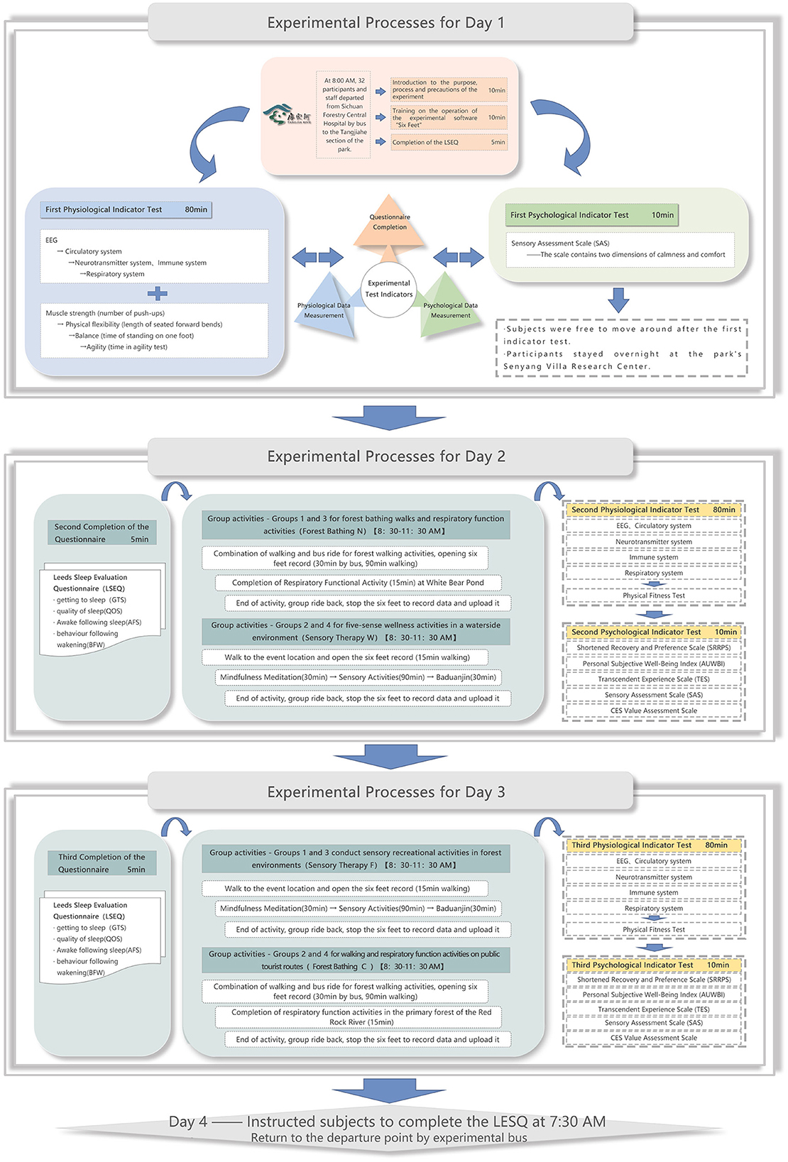 Day 2 (June 12/14) At 7:30 AM, participants filled out the previous night's LSEQ. Staff then guided participants in group activities for 3 h (8:30 to 11:30 AM) at their respective experimental sites. Groups 1 and 3 engaged in FBN, while groups 2 and 4 engaged in STW. During the activities, participants recorded CES perceived values. The experiments at both research sites were conducted simultaneously. In FBN, staff guided participants on a combined walking and bus (experimental tour bus) journey along the experimental route, with a total of 30 min of bus rides and 90 min of walking, including breaks, completing 15-min respiratory function activities. In STW, participants engaged in 30 min of mindfulness meditation, 90 min of sensory activities (smell, taste, and touch), including plant mandalas and tree hugging, and 30 min of Baduanjin exercises. After the activities, participants returned collectively (travel time 30 min), rested for 10 min, and then completed the second set of physiological measurements and physical fitness tests, followed by psychological scales and CES value assessments. The second day's experiment concluded.