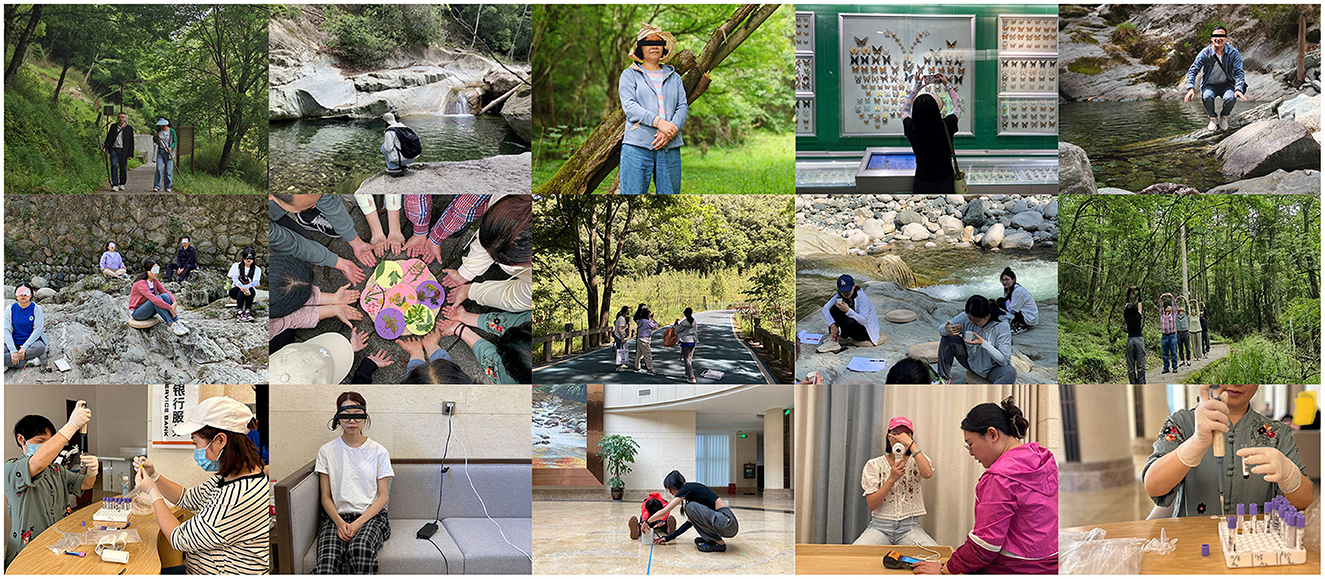 The experiment was conducted in the Tangjiahe section of the GPNP from June 11 to 15, under favorable weather conditions. During June 11–15, the average environmental temperature along two routes ranged from 16°C to 23°C, humidity ranged from 68 to 81% RH, PM2.5 ranged from 4 to 12 μg/m3, and negative oxygen ions ranged from 5,478.00 to 6,695.58/cm3 (Tables 2, 3). 32 participants were randomly assigned experimental numbers from 1 to 32, divided into four groups (1, 2, 3, and 4) of eight participants each. Groups 1 and 2 were tested from June 11 to 13, while groups 3 and 4 were tested from June 13 to 15. The experimental process for groups 1 and 3 was identical to that of groups 2 and 4, conducted simultaneously to eliminate time differences‘ effects. Researchers only informed participants of the experimental purpose without disclosing detailed procedures, and encouraged them to walk leisurely in the forest while engaging in multisensory perception. During the experiment, participants practiced forest bathing and completed sensory therapy activities at designated sites. These activities, including observing flora and fauna, listening to flowing water, inhaling forest air, and tree hugging, aimed to facilitate self-forgetfulness and foster interaction with nature within the national park's forest environment. Numerous photographs taken by accompanying staff documented participants' relaxed states while avoiding potential intervention risks.