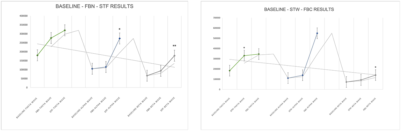 Compared to baseline values, there were no statistically significant differences in theta, alpha, and beta wave values after FBN (P > 0.05), though an upward trend was observed. After STF, alpha (pre-experiment to post-experiment is [1,04,916.53 ± 1,19,003.17] to [2,73,893.28 ± 2,47,930.68]) and beta ([66,260.05 ± 75,511.02] to [1,77,799.69 ± 1,10,698.34]) wave values showed statistically significant differences (P < 0.05). Specifically, theta wave increased after FBN and STF were 96,715 and 1,39,593, respectively. Alpha wave values increased by 9,823 and 1,68,976 after FBN and STF, respectively, with the STF increase showing significant difference ([1,04,916.53 ± 1,19,003.17] to [2,73,893.28 ± 2,47,930.68]; P = 0.011). Beta wave values increased by 27,018 and 111,539 after FBN and STF, respectively, with the STF increase showing significant difference ([66,260.15 ± 75,511.02] to [1,77,799.69 ± 1,10,698.34]; P = 0.005). Compared to baseline values, theta, alpha, and beta wave values increased after both FBC and STW. Specifically, theta wave values increased by 146,808 after STW ([1,83,408.14 ± 1,77,499.73] to [3,30,216.71 ± 1,57,293.53]; P = 0.019), while beta wave values increased by 67,483 after FBC ([72,958.75 ± 71,516.33] to [1,40,442.67 ± 89,273.58]; P = 0.05), both showing statistically significant differences (Figure 7).