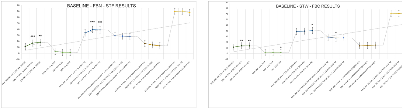 Figure 9. Immune system lymphocyte subpopulation test results. N = 32. *p < 0.05, **p < 0.01, ***p < 0.001.