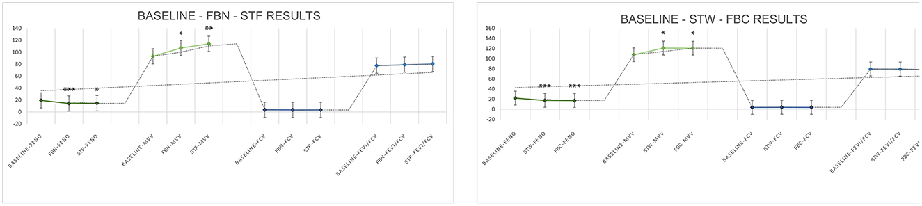 Figure 10. Respiratory (FeNO, MVV, FVC, FEV1/FVC) test results. N = 32. *p < 0.05, **p < 0.01, ***p < 0.001.
