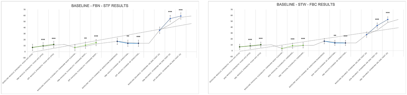Regarding physical fitness (capacity building), all metrics showed significant improvements after FBN and STF compared to respective baseline values. Specifically: muscle strength (push-ups: reps) increased by 2.57 ([7.14 ± 5.63] to [9.71 ± 7.12], P = 0.001) and 4.93 ([7.14 ± 5.63] to [12.07 ± 7.48], P < 0.001). Flexibility (sit and reach: cm) increased by 3.93 ([6.93 ± 8.90] to [10.86 ± 2.59], P = 0.010) and 8.14 ([6.93 ± 8.90] to [15.07 ± 9.64], P < 0.001). Agility (shuttle run: s) decreased by 3.22 ([17.23 ± 3.92] to [14.01 ± 1.35], P = 0.002) and 3.22 ([17.23 ± 3.92] to [14.01 ± 1.43], P = 0.001). Balance (one-leg stand: s) increased by 19.21 ([35.71 ± 18.69] to [54.93 ± 22.39], P < 0.001) and 23.50 ([35.71 ± 18.69] to [59.21 ± 25.67], P < 0.001). Significant improvements were observed after both STW and FBC. Specifically: muscle strength (push-ups: reps) increased by 1.71 ([6.50 ± 4.15] to [8.21 ± 4.49], P < 0.001) and 3.64 ([6.50 ± 4.15] to [10.14 ± 5.14], P < 0.001). Flexibility (sit and reach: cm) increased by 4.57 ([3.86 ± 9.88] to [8.43 ± 9.23], P = 0.001) and 5.29 ([3.86 ± 9.88] to [9.14 ± 9.00], P < 0.001). Agility (shuttle run: s) decreased by 2.99 ([16.21 ± 3.60] to [13.21 ± 1.11], P = 0.004) and 3.06 ([16.21 ± 3.60] to [13.14 ± 1.53], P = 0.001). Balance (one-leg stand: s) increased by 15.43 ([27.29 ± 10.82] to [42.71 ± 11.85], P < 0.001) and 25.79 ([27.29 ± 10.82] to [53.07 ± 11.72], P < 0.001) (Figure 14). The results indicate that forest bathing and sensory therapy activities in diverse environments within the GPNP significantly enhance physical fitness.