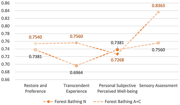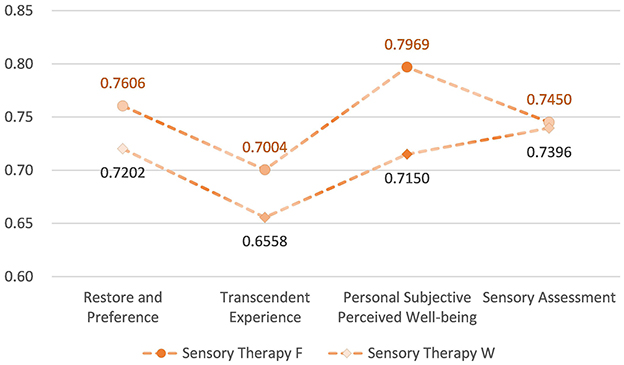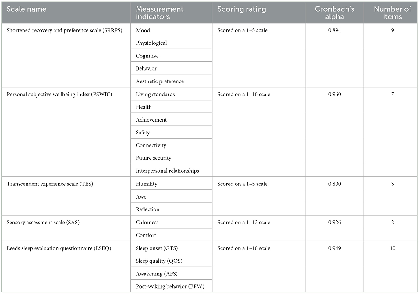 Psychological health measurements in this study are shown in Table 5 Based on prior research, a self-report measure was developed to assess the restorative potential of different landscape environments across four dimensions: restorative experience, positive emotions, stress relief, and physiological-cognitive responses (Thomas and Palma, 2018). The revised version of the SRRPS (Han, 2003) includes five dimensions: emotions, physiology, cognition, behavior, and aesthetic preferences, with a total of 9 items, each rated on a 1–5 scale (5 indicating the best psychological restoration effect and 1 indicating the worst). The total value of Cronbach's α coefficient for the scale is 0.894. The PSWBI (Cummins et al., 2003) includes seven dimensions: living standard, health, achievement, safety, connection, future security, and interpersonal relationships, with a total of 7 items, each rated on a 1–10 scale (10 indicating the best level of wellbeing effect and 1 indicating the worst). The total value of Cronbach's α coefficient for the scale is 0.960. The TES (Ballew and Omoto, 2018; Kaplan and Kaplan, 1989) includes 3 dimensions: humility, awe, and reflection, with a total of 3 items, each rated on a 1–5 scale (5 indicating the best experience and 1 indicating the worst). The total value of Cronbach's α coefficient for the scale is 0.800. In addition, a (SAS Park et al., 2007) was added, which includes two dimensions: calmness and comfort, with a total of 2 items, each rated on a 1–13 scale (13 indicating the highest level of sensory assessment effects and 1 indicating the lowest level). The total value of Cronbach's α coefficient for the scale is 0.926.