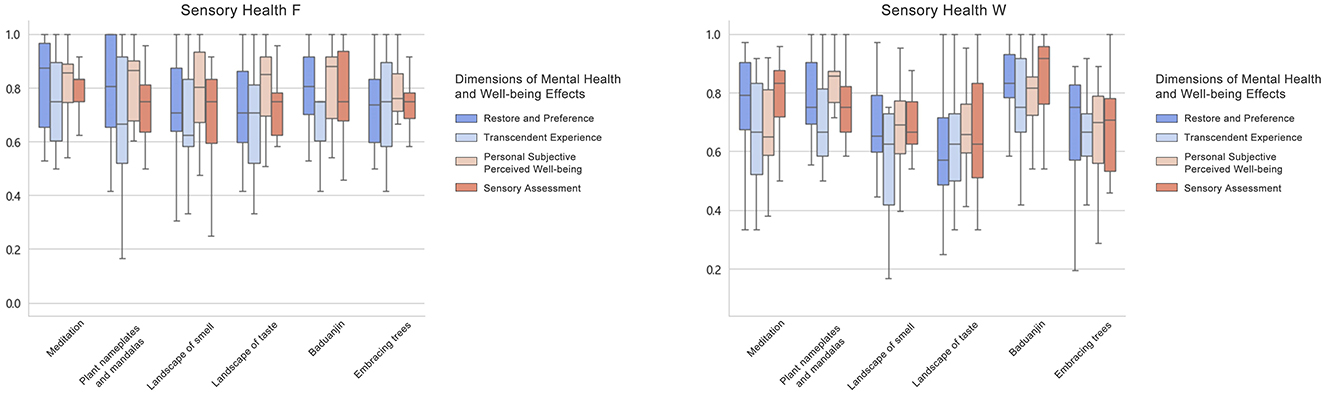 The overall means of the four dimensions of mental health and wellbeing effects after STF were distributed between 0.70 and 0.80, all greater than 0.5. There was significant variability between the dimensions of Transcendent Experience and Personal Subjective Perceived Wellbeing. The types of recreational activities that produced the highest rankings for Restore and Preference and Personal Subjective Perceived Wellbeing were: meditation, baduanjin, plant nameplates and mandalas. Transcendental Experiences were meditation, embracing trees and baduanjin. Sensory Assessments were meditation, baduanjin, and embracing trees. The overall mean distribution of the four dimensions of mental health and wellbeing effects produced after STW ranged from 0.66 to 0.74, which were all greater than 0.5. There were no significant differences in the effects of the dimensions. The types of recreational activities that produced the highest rankings of Restore and Preference and Transcendent Experience were all: baduanjin, plant nameplates and mandalas, and meditation. Individual subjective perceptions of wellbeing were plant nameplates and mandalas, baduanjin, and landscape of smell. Sensory assessments were baduanjin, meditation, and plant nameplates and mandalas (Figures 21, 22).