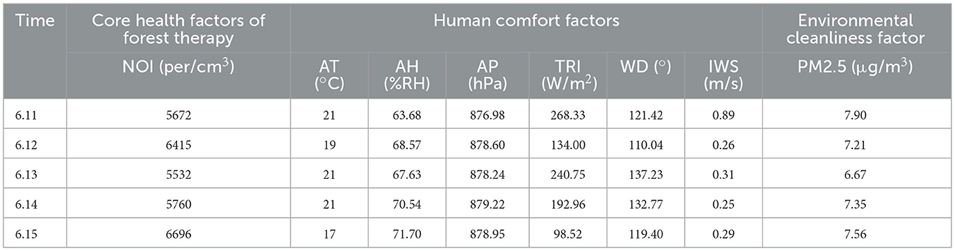 Based on preliminary research, the study selected the Tangjiahe area of the GPNP as the experimental site, located in Qingchuan County, Guangyuan City, Sichuan Province. The climate here is a northern subtropical humid monsoon climate, characterized by four distinct seasons. This area has a well-preserved natural ecosystem and abundant biological resources, making it one of the world's most biodiversity-rich hotspots and the region with the highest encounter rates of rare wildlife in low-altitude areas globally. Based on preliminary surveys and the requirements of this study, the linear and point spaces for conducting this experimental activity were determine (Figure 1). During the experimental period, staff meticulously recorded meteorological and environmental quality data of the experimental area, including representative core health factors of forest therapy: negative Oxygen Ions (NOI). Human comfort factors included Ambient Temperature (AT), Ambient Humidity (AH), Atmospheric Pressure (AP), Total Radiation Instantaneous (TRI), Wind Direction (WD), Instantaneous Wind Speed (IWS), and Sound Pressure Level (SPL). The representative environmental cleanliness factor was PM2.5 (Tables 2, 3).