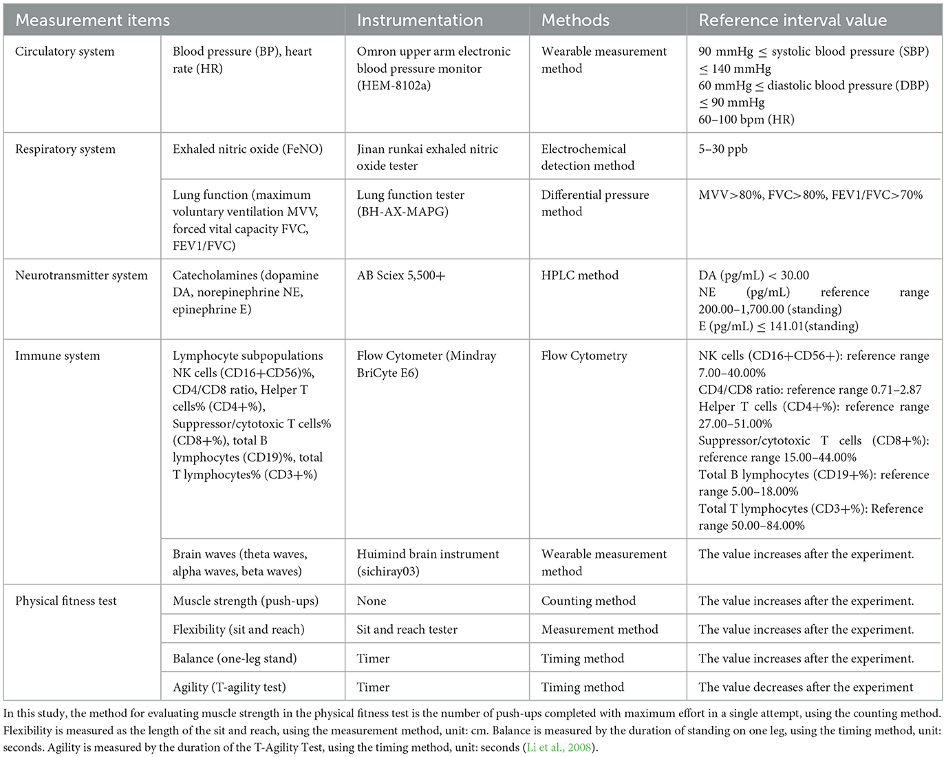 HR and BP are commonly used as indicators of physiological response. Previous research has widely confirmed that EEG can be used to measure brain activity. Different frequency bands reflect different emotional states and cognitive abilities. An increase in theta waves usually indicates a deeply relaxed state, which is associated with enhanced creativity (Schacter, 1977). Alpha waves are closely related to positive emotions and stress relief, with an increase typically indicating relaxation (Klimesch, 1999). An increase in beta waves is usually associated with alertness, while a decrease indicates drowsiness (Lee B. G. et al., 2014). The catecholamine system (3 items) includes dopamine (DA), norepinephrine (NE), and epinephrine (E), which are sympathetic neurotransmitters that influence both emotional responses and cardiovascular activity. Measurement of neurotransmitters can effectively analyze the effects of stimuli on receptors (Ramos and Mormède, 1997). The immune system plays a critical role in maintaining human health, with T cells, B cells, and natural killer (NK) cells being important immune cells. Analysis of T, B, and NK cells helps assess immune function levels and human health benefits (Li et al., 2007, 2008). The respiratory system plays a key role in normal life activities. The natural environment improves air quality and intercepts particles to reduce symptoms of acute respiratory diseases (Nowak et al., 2018). FeNO measurement reflects airway inflammation, with a decrease within the normal range indicating reduced small airway inflammation (Munakata, 2012). Lung ventilation measures respiratory airflow, lung volume, and gas exchange capabilities, with increases within the normal range indicating stronger respiratory capacity and lung function (Zhou and Zheng, 2012). Previous studies have shown that measuring respiratory-related indicators to assess the health and wellbeing benefits of natural ecosystems is both important and feasible (Seo et al., 2015). The characteristics of green spaces are closely related to physical activity and resident health (Thompson Coon et al., 2011). Specific measurement methods are outlined in Table 4.
