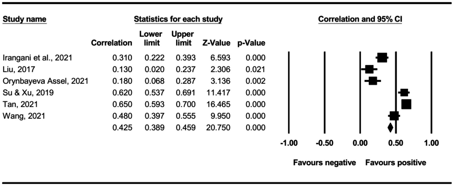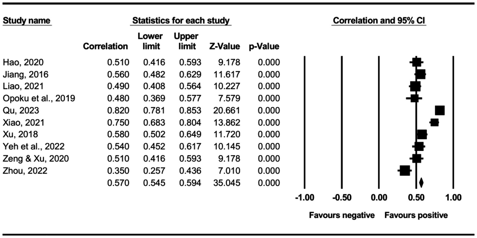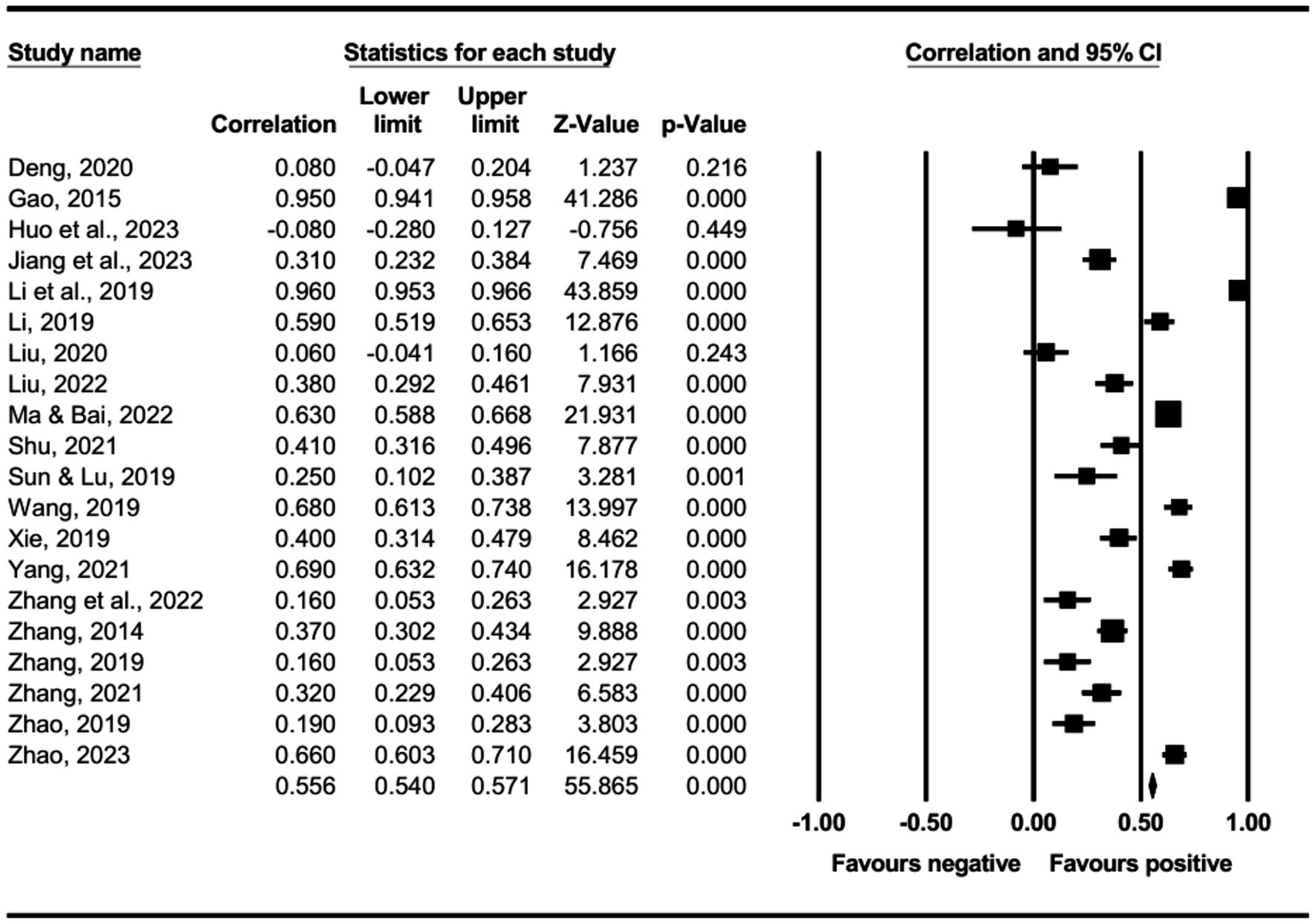 This study utilizes CMA3.0 for conducting meta-analysis tests. The correlation coefficient (r) is used as the effect size, and each effect size are corrected using reliability coefficients. For studies with missing reliability information, we used the mean of reliabilities of the studies that reported reliability information, and ultimately, the true correlation coefficient (ρ) is calculated (Hunter and Schmidt, 2004). We also calculated corrected 95% confidence intervals to determine the statistical significance of effect sizes. If the confidence intervals do not include zero, effect sizes are considered to be statistically significant.