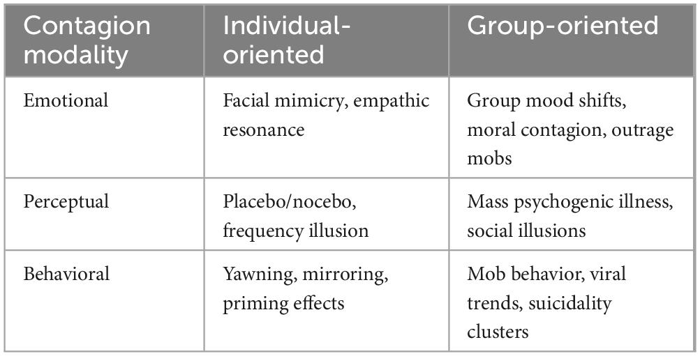 This paper examines the broad PC-related literature relative to the three primary components of human experience (Eagly and Chaiken, 1993; Ajzen, 2001; Hogg and Vaughan, 2005)—(a) emotional (i.e., affective), (b) perceptual (i.e., cognitive), and (c) behavioral (i.e., conative)—and explores how they interrelate. Table 1 lists representative phenomena that instantiate these three forms, and in a later section we introduce cross-cutting mechanisms used to interpret them. While each domain involves some distinct mechanisms, they are unified by their capacity to inflate an individual’s experience and propagate it across social systems. To account for this proliferation, we explore how contagion potentially scales from person-oriented effects (e.g., priming, mimicry, suggestion) to group-level dynamics (e.g., mass psychogenic illness, social movements) via a proposed process in which suggestion and attention, operating through shared identity and media amplification, escalates intrapsychic shifts into collective psychological states.