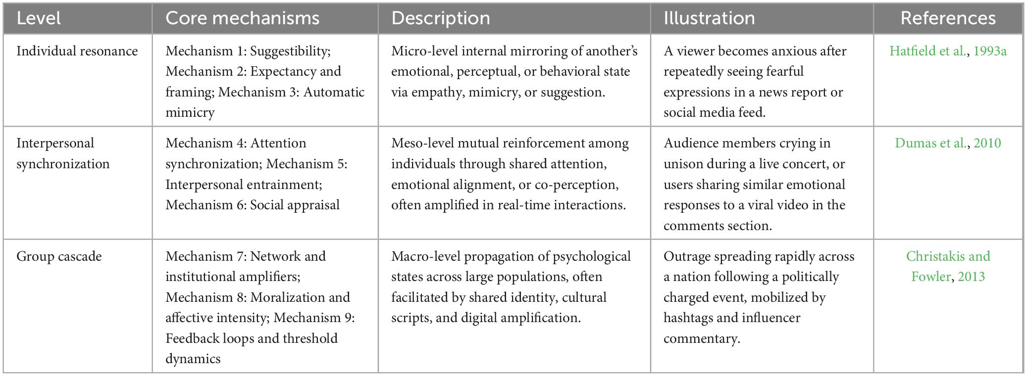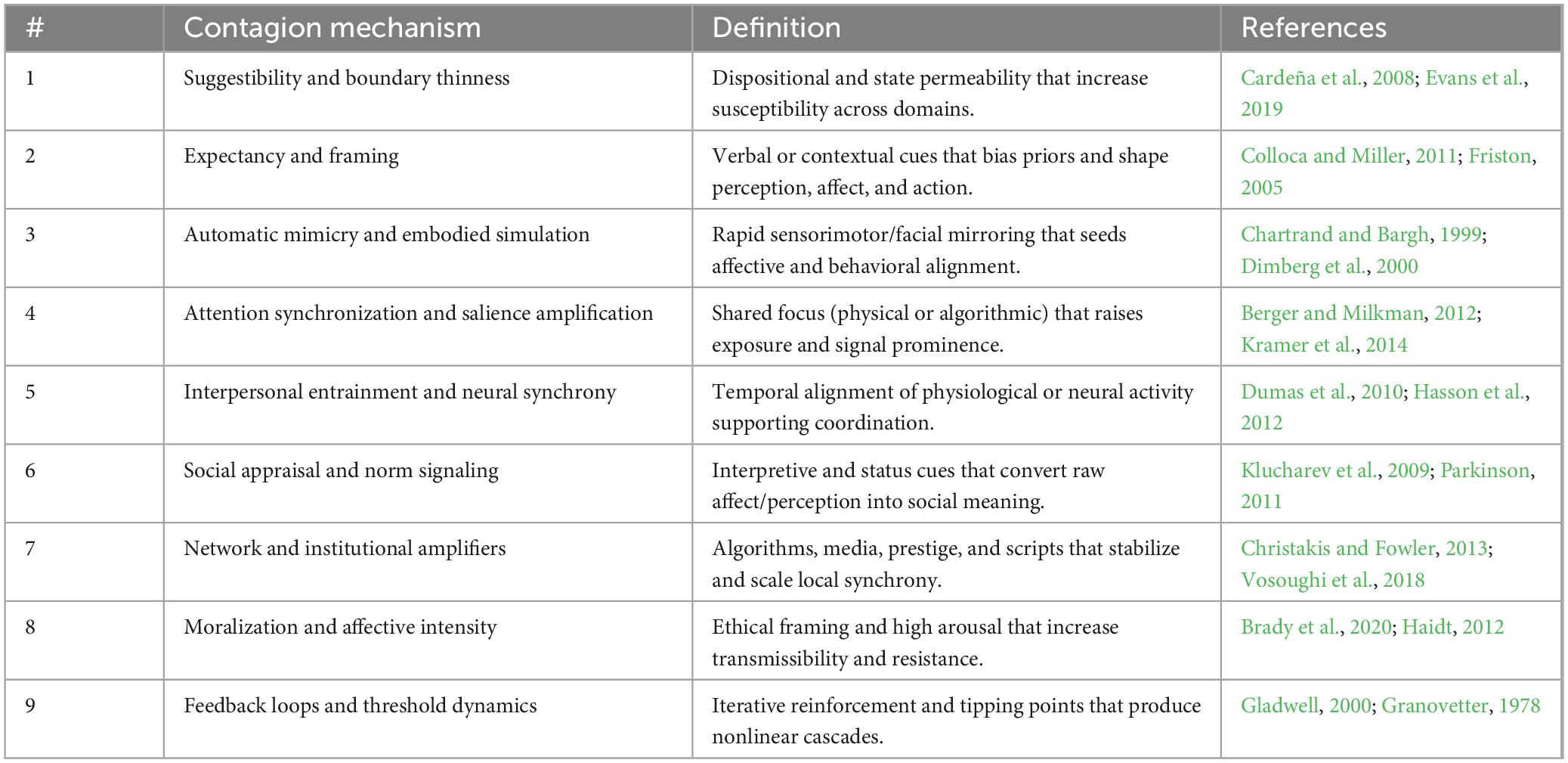 Specifically, Table 3 defines Mechanism 1: Suggestibility and boundary thinness; Mechanism 2: Expectancy and framing; Mechanism 3: Automatic mimicry and embodied simulation; Mechanism 4: Attention synchronization and salience amplification; Mechanism 5: Interpersonal entrainment and neural synchrony; Mechanism 6: Social appraisal and norm signaling; Mechanism 7: Network and institutional amplifiers; Mechanism 8: Moralization and affective intensity; and Mechanism 9: Feedback loops and threshold dynamics.