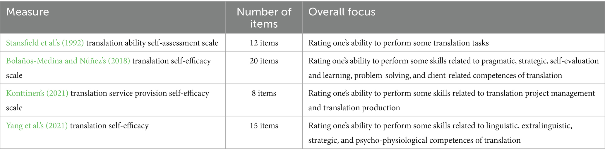All the measures selected for review in this study were published in internationally recognized sources. To locate the published works in which these measures were included, we started first by searching for the relevant works in internationally well-known relevant journals, including Across Languages & Cultures, Babel/International Journal of Translation, International Journal of Interpreter Education, Interpreting, Meta: Translators’ Journal, Perspectives, Target, The Interpreter & Translator Trainer, The Interpreters’ Newsletter, The Translator, and Translation & Interpreting Studies. We searched for the works in these journals using keywords related to the two target constructs. The same keywords were also used in searches conducted through international databases and Google Scholar. This broader search revealed additional scales published in other multidisciplinary journals. These multiple search strategies helped us locate a total of seven published measures for the review (four translation self-efficacy and three interpreting self-efficacy scales). The seven scales were fully published by their developers in the works they authored. Furthermore, three additional studies reported using two interpreting self-efficacy scales (Cifuentes-Férez et al., 2024; Xu and Liu, 2023) and one translation self-efficacy scale (Yang et al., 2016), but the measures were not included in these studies and were therefore excluded from the review. We evaluated the seven published translation and interpreting self-efficacy measures in terms of their item representation of the assessed construct and the self-efficacy dimensions they covered.