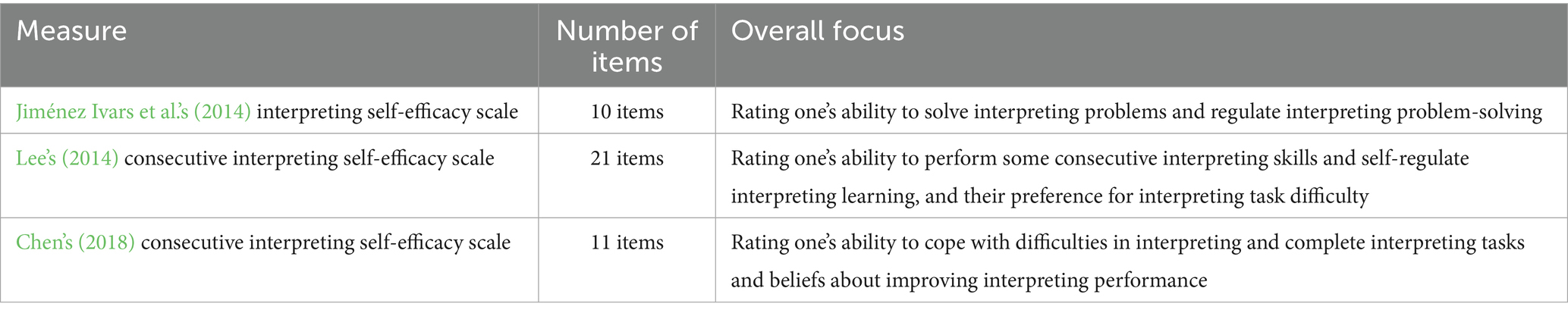 The three interpreting self-efficacy measures reviewed were published by Jiménez Ivars et al. (2014), Lee (2014), and Chen (2018). Table 2 shows a summary of the three measures.