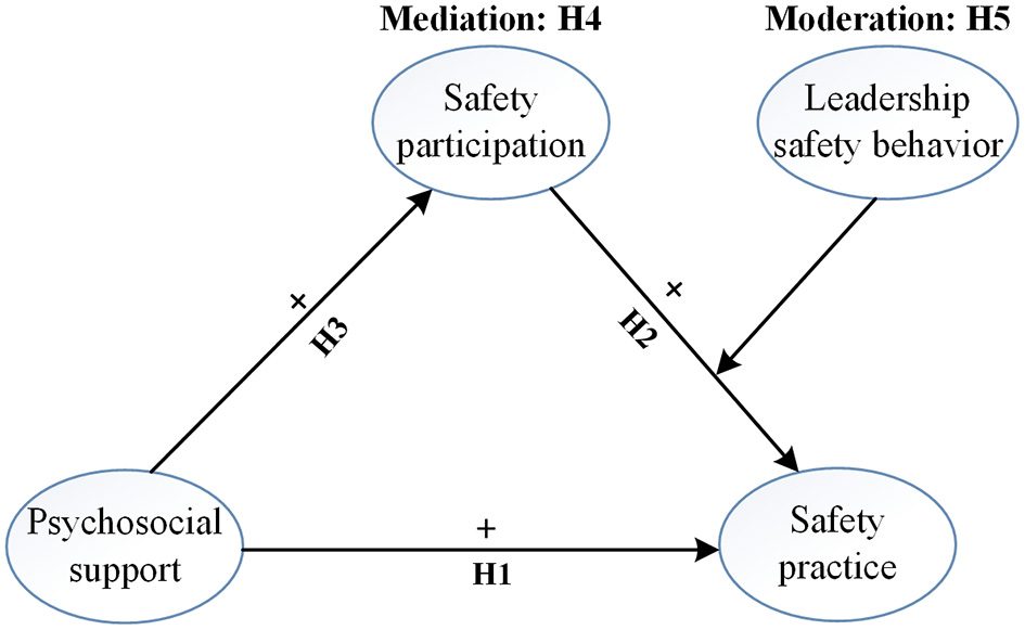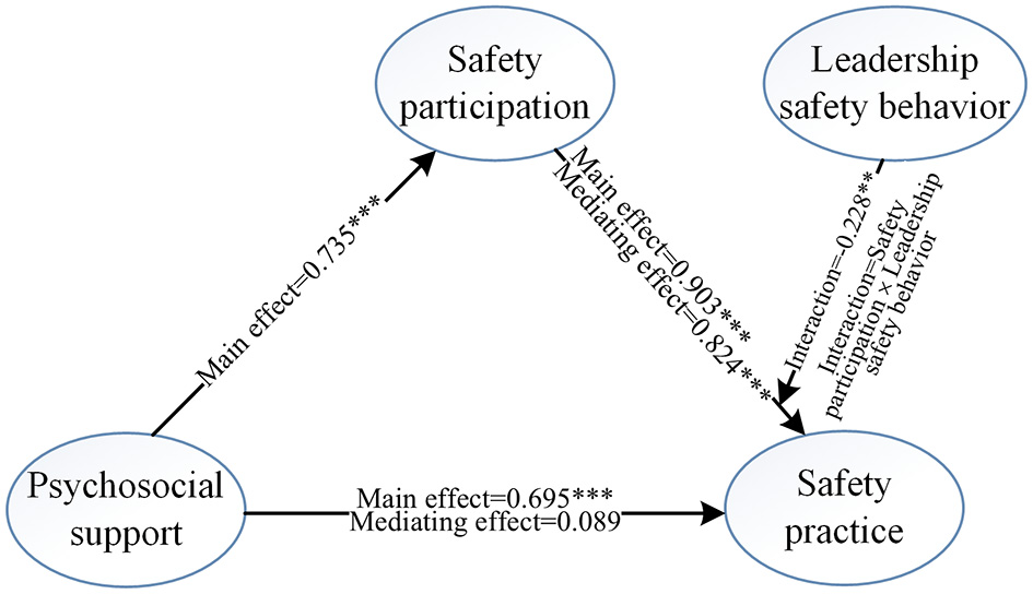 The findings reveal that: (1) psychosocial support positively influences both safety participation and safety practices; (2) safety participation enhances safety practices; (3) safety participation fully mediates the effect of psychosocial support on safety practices; and (4) leadership safety behavior positively moderates the relationship between safety participation and safety practices.