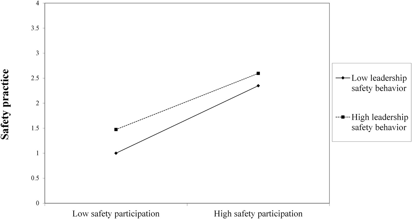 Hypothesis 5 (H5): leadership safety behavior moderates the relationship between safety participation and safety practice. Specifically, the positive impact of safety participation on safety practice is stronger when leadership safety behavior is high than when it is low.