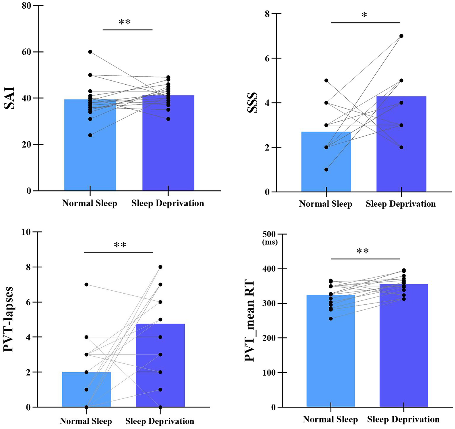 Statistical differences in SAI, SSS, mean RT, and number of lapses between normal sleep and sleep deprivation sessions. SAI represents State Anxiety Inventory, SSS represents Stanford Sleepiness Scale. **p < 0.01, *p < 0.05.
