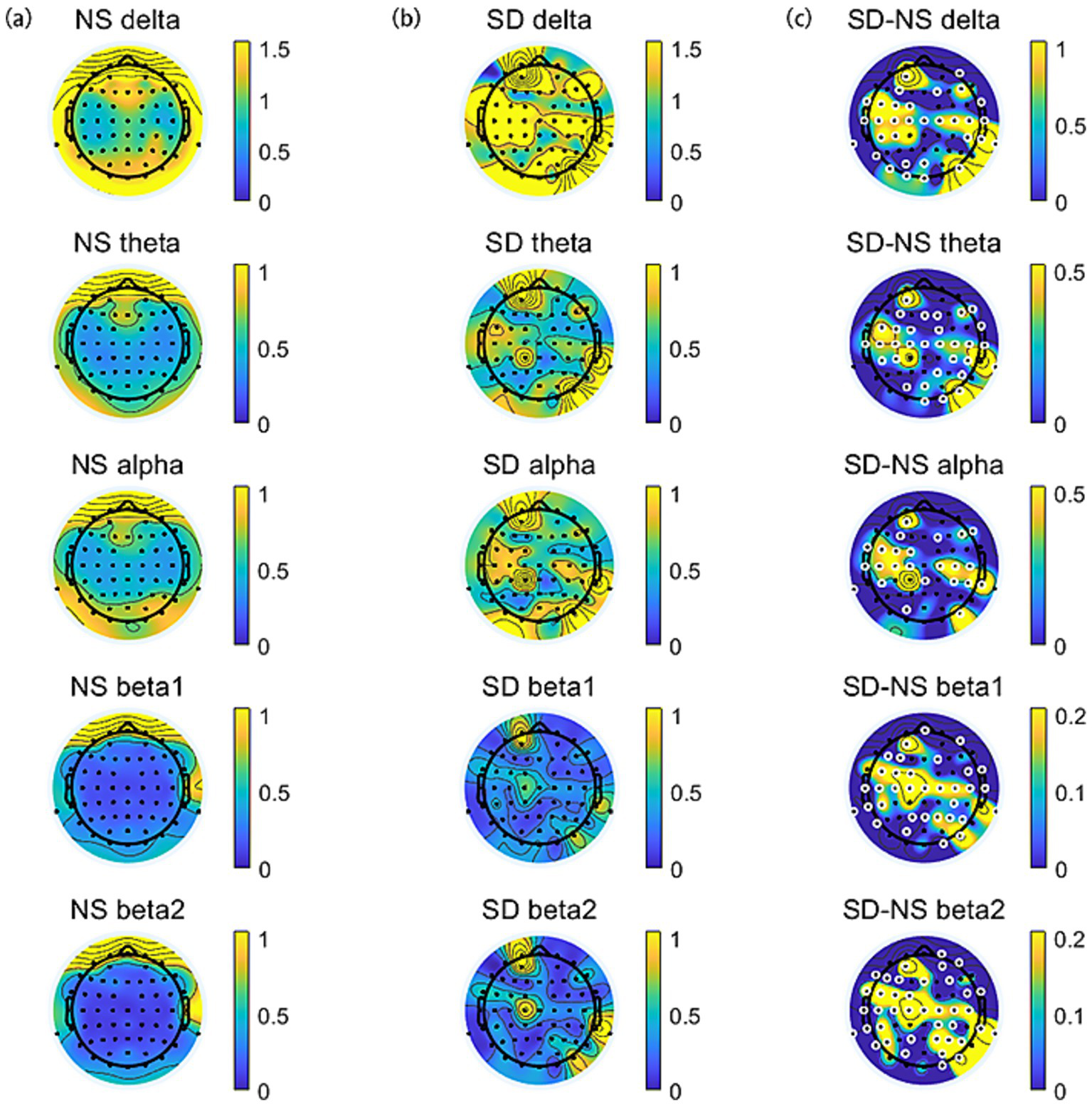 The topographic distribution of spectral power across frequency bands (delta, theta, alpha, beta1, and beta2). (a) Normal sleep session. (b) Sleep deprivation session. (c) The difference (SD–NS). Electrodes with significant differences between sessions are highlighted by enlarged white circles.