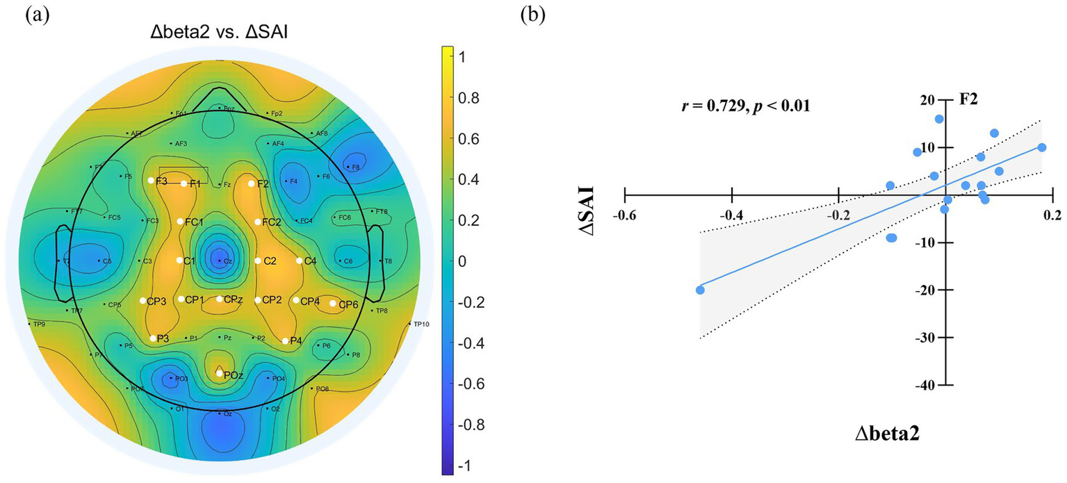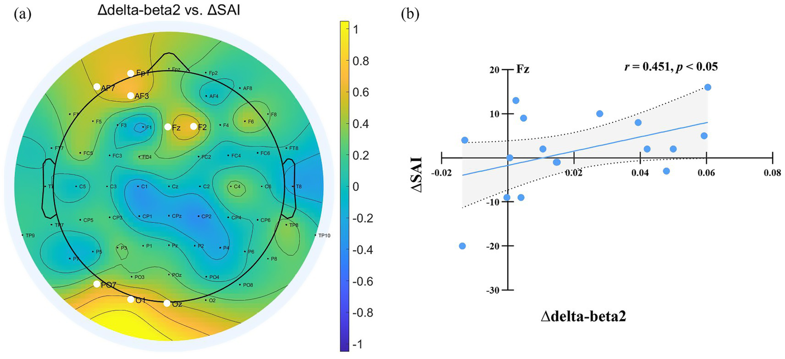 (a) Relationship Between delta-beta PAC Changes and SAI Variation After Sleep Deprivation. ∆ denotes the difference in EEG power and State Anxiety Inventory (SAI) scores between the sleep deprivation (SD) and normal sleep (NS) sessions (SD–NS). Electrodes showing a significant correlation between changes in delta-beta PAC and SAI variation are highlighted by enlarged white circles. (b) Changes in delta-beta2 PAC power at Fz were significantly positively correlated with the changes in state anxiety across the two sessions.