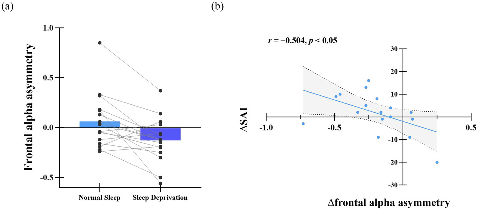 (a) Difference in frontal alpha asymmetry score. (b) Relationship between frontal alpha asymmetry change and SAI variation. Δ denotes the difference in frontal alpha asymmetry scores between the sleep deprivation (SD) and normal sleep (NS) sessions (SD–NS).