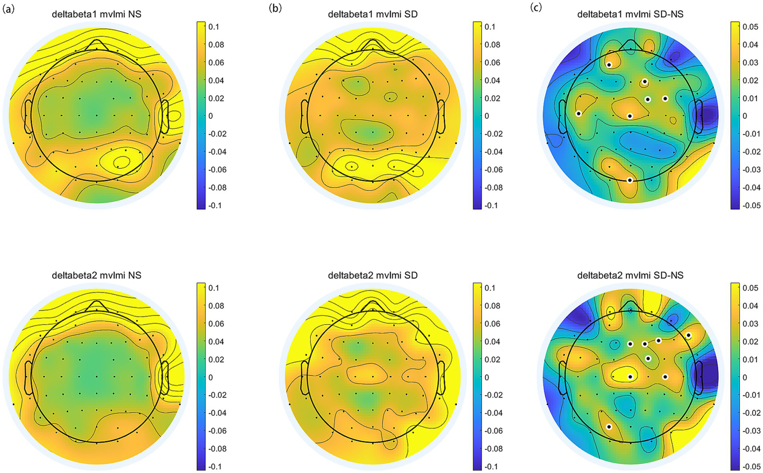 The topographic distribution of delta-beta PAC. (a) Normal Sleep session. (b) Sleep Deprivation session. (c) The difference (SD–NS). Electrodes with significant differences between sessions are highlighted by enlarged white circles.