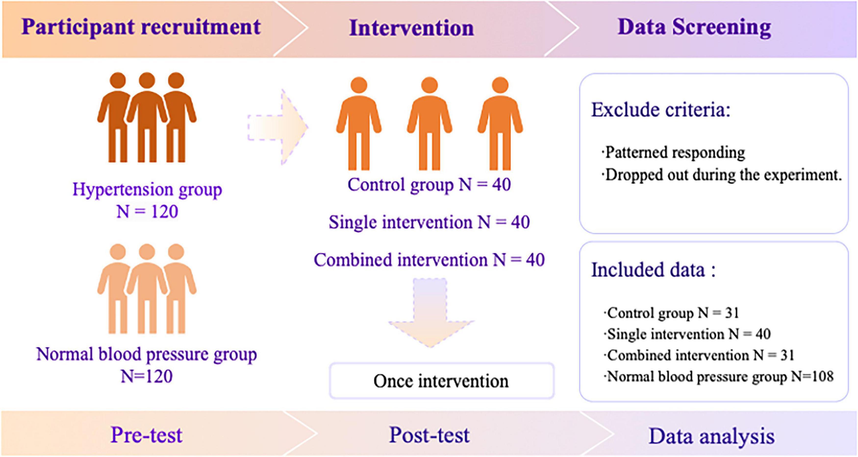 120 male participants with hypertension were recruited from pilot medical examination. Participants were recruited for this study if they met the following criteria: (1) Met the specified range of the 2018 Chinese Hypertension Prevention and Treatment Guidelines, where hypertension is defined as a systolic blood pressure ≥ 140 mm Hg and/or a diastolic blood pressure ≥ 90 mm Hg (1 mm Hg = 0.133 kPa) (Li-Sheng, 2019); (2) had no organic damage such as retinal lesions or electrocardiographic abnormalities; (3) had no history of hypertension or syncope; (4) had no family history of hypertension; (5) had no history of anemia, hyperthyroidism, adrenal cortical adenoma, or other diseases affecting the cardiovascular system.