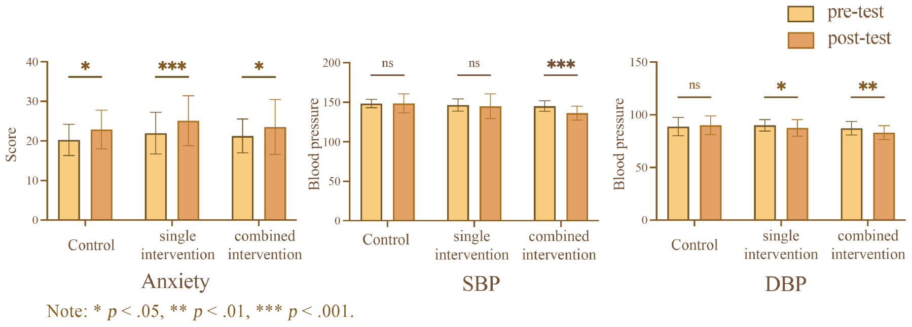 There are several limitations in the study. First, the study lacks follow-up data, so it is unclear whether the effects of the intervention are short term or long term. Future research should include follow-up assessments. Second, the study only focused on the relationship between anxiety and blood pressure, but other psychological factors may also affect blood pressure. Future studies could look at other factors. Third, the study only used questionnaires and experimental methods. Using other methods could get a broader perspective in the future study. Fourth, the durations of the single and combined psychological interventions differed. Although there was a certain interval between the interventions and the second measurement, the difference in intervention duration could still potentially affect blood pressure readings.