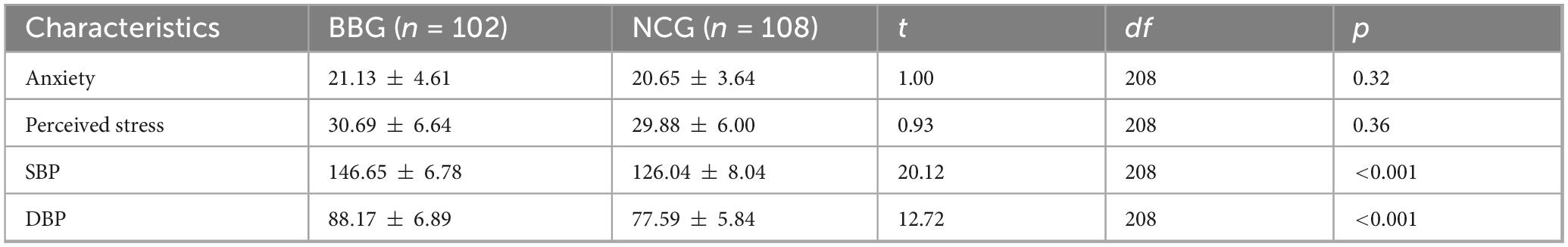Table 1 revealed no significant differences between the BBG and NCG in terms of anxiety and perceived stress (both p > 0.05). However, a substantial difference was observed between the groups regarding systolic blood pressure (SBP) and diastolic blood pressure (DBP), with the BBG group showing significantly higher values than the NCG group (t = 20.61, p < 0.001, t = 10.73, p < 0.001). This result demonstrates that the grouping is effective.