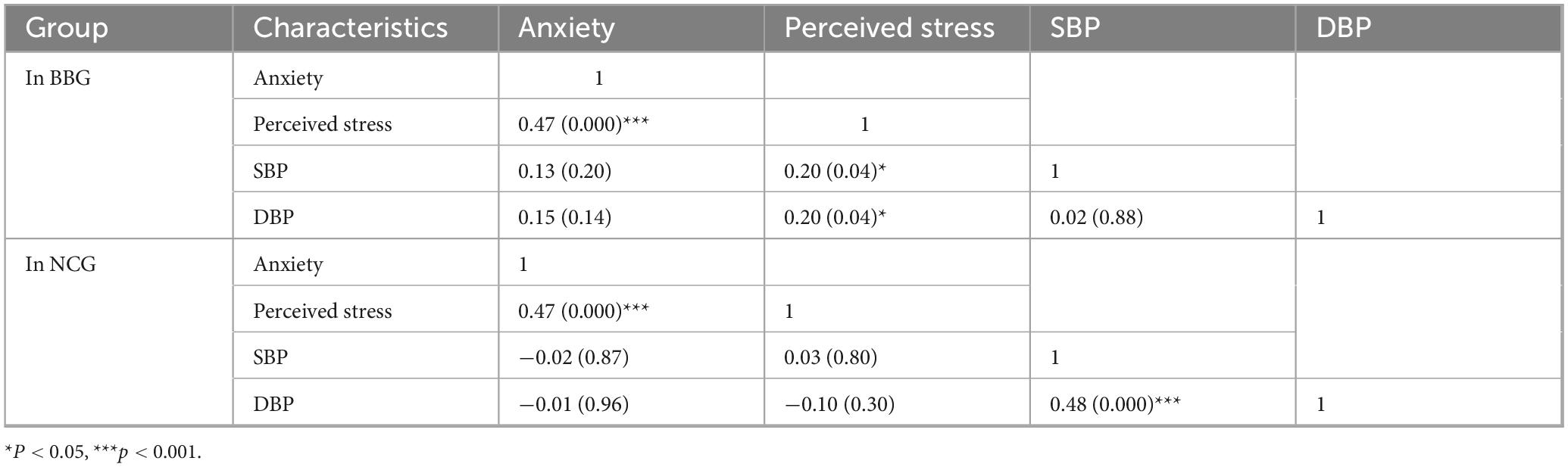 Table 2 showed a significant correlation positive correlation between anxiety and perceived stress (r = 0.47, p < 0.001) within BBG; however, no significant correlation was found between SBP and DBP. Anxiety showed marginally significant correlation with both SBP and DBP (r = 0.13, p = 0.20; r = 0.15, p = 0.13). Additionally, perceived stress showed a significant correlation with both SBP and DBP (r = 0.20, r = 0.20, both p < 0.05). Similarly, within the NCG group detected a significant positive correlation between anxiety and perceived stress (r = 0.47, p < 0.001) and between SBP and DBP (r = 0.48, p < 0.001).