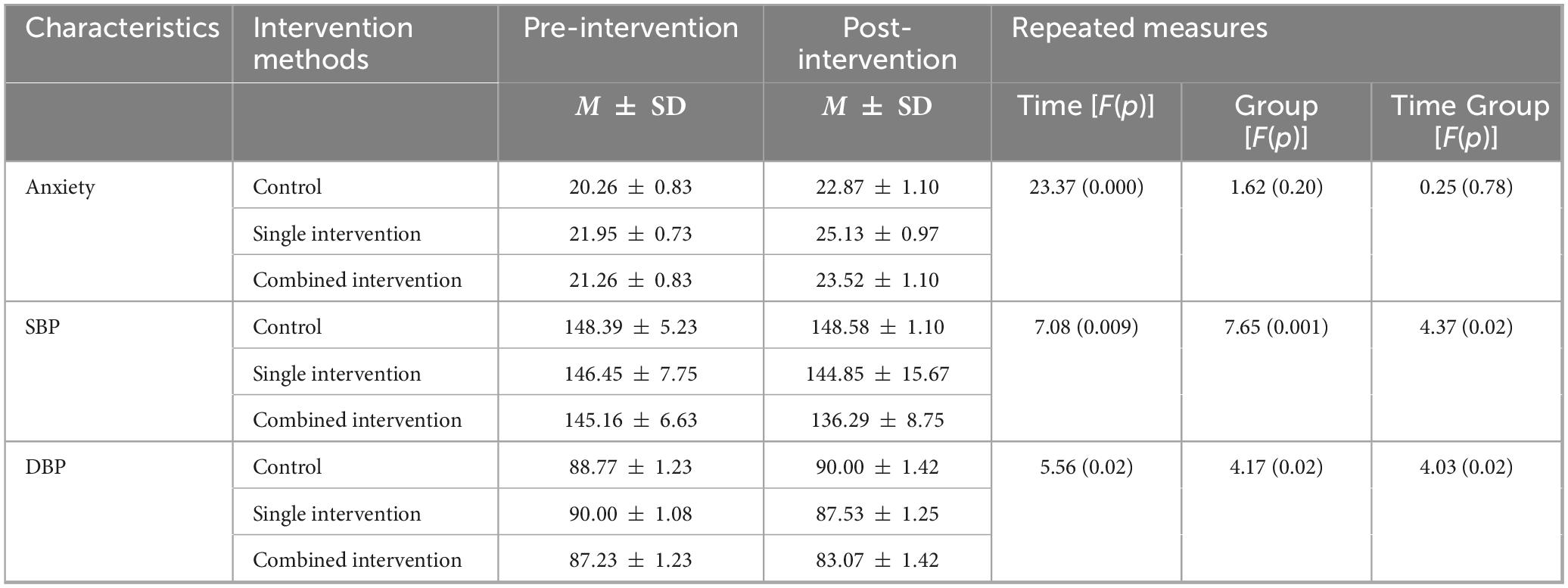 3.3 Effect of intervention method and pre- and post-intervention on the anxiety, SBP and DBP